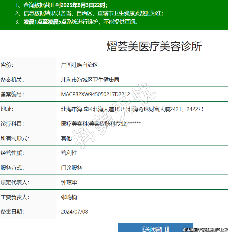 省份:廣西壯族自治區(qū)備案機關:北海市海城區(qū)衛(wèi)生健康局備案編號:MACPB2XW945050217D2212地址:北海市海城區(qū)北海大道181號北海奇珠財富大廈2421、2422號診療科目:醫(yī)療美容科(美容皮膚科專業(yè))******所有制形式:其他經營性質:營利性服務方式:門診服務法定代表人:鐘瓊華主要負責人:張鳴鏑備案日期:2024/07/08 -
