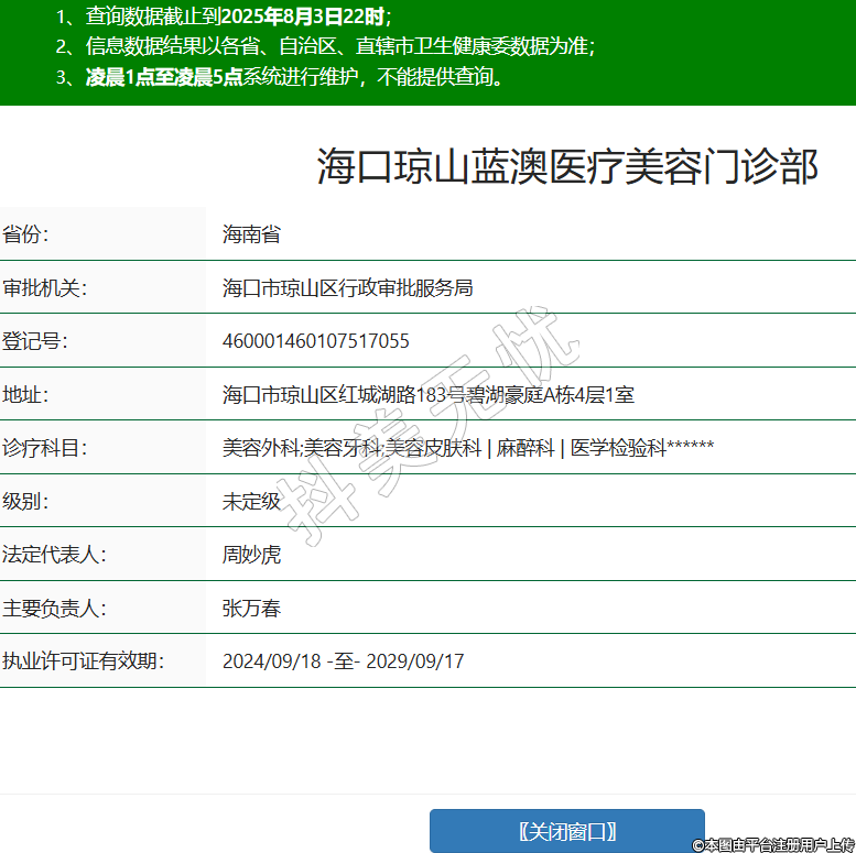 省份:海南省審批機(jī)關(guān):??谑协偵絽^(qū)行政審批服務(wù)局登記號(hào):460001460107517055地址:??谑协偵絽^(qū)紅城湖路183號(hào)碧湖豪庭A棟4層1室診療科目:美容外科;美容牙科;美容皮膚科 | 麻醉科 | 醫(yī)學(xué)檢驗(yàn)科******級(jí)別:未定級(jí)法定代表人:周妙虎主要負(fù)責(zé)人:張萬春執(zhí)業(yè)許可證有效期:2024/09/18 -至- 2029/09/17 -