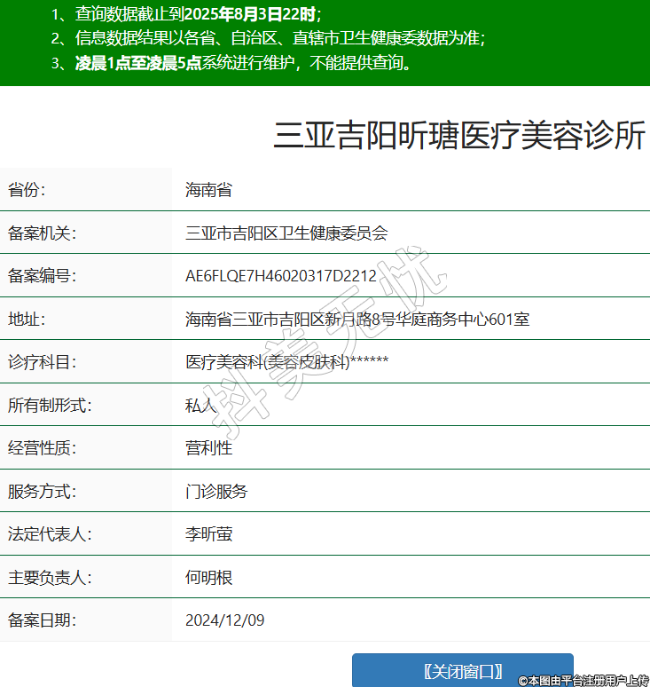 省份:海南省備案機關:三亞市吉陽區(qū)衛(wèi)生健康委員會備案編號:AE6FLQE7H46020317D2212地址:海南省三亞市吉陽區(qū)新月路8號華庭商務中心601室診療科目:醫(yī)療美容科(美容皮膚科)******所有制形式:私人經(jīng)營性質(zhì):營利性服務方式:門診服務法定代表人:李昕螢主要負責人:何明根備案日期:2024/12/09 -