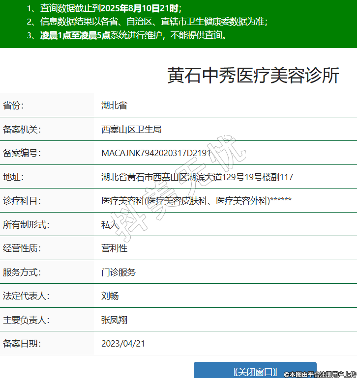 省份:湖北省備案機(jī)關(guān):西塞山區(qū)衛(wèi)生局備案編號(hào):MACAJNK7942020317D2191地址:湖北省黃石市西塞山區(qū)湖濱大道129號(hào)19號(hào)樓副117診療科目:醫(yī)療美容科(醫(yī)療美容皮膚科、醫(yī)療美容外科)******所有制形式:私人經(jīng)營(yíng)性質(zhì):營(yíng)利性服務(wù)方式:門診服務(wù)法定代表人:劉暢主要負(fù)責(zé)人:張鳳翔備案日期:2023/04/21 -
