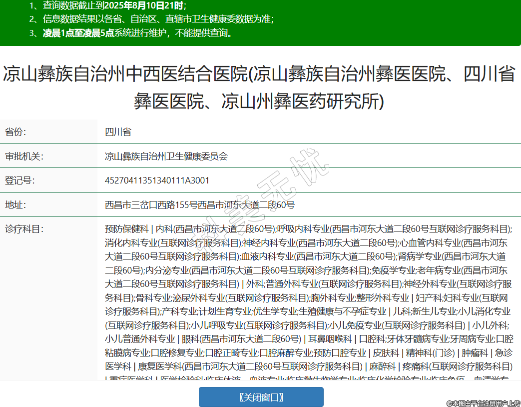 省份:四川省審批機關:涼山彝族自治州衛(wèi)生健康委員會登記號:45270411351340111A3001地址:西昌市三岔口西路155號西昌市河東大道二段60號診療科目:預防保健科 | 內科(西昌市河東大道二段60號);呼吸內科專業(yè)(西昌市河東大道二段60號互聯(lián)網(wǎng)診療服務科目);消化內科專業(yè)(互聯(lián)網(wǎng)診療服務科目);神經內科專業(yè)(西昌市河東大道二段60號);心血管內科專業(yè)(西昌市河東大道二段60號互聯(lián)網(wǎng)診療服務科目);血液內科專業(yè)(西昌市河東大道二段60號);腎病學專業(yè)(西昌市河東大道二段60號);內分泌專業(yè)(西昌市河東大道二段60號互聯(lián)網(wǎng)診療服務科目);免疫學專業(yè);老年病專業(yè)(西昌市河東大道二段60號互聯(lián)網(wǎng)診療服務科目) | 外科;普通外科專業(yè)(互聯(lián)網(wǎng)診療服務科目);神經外科專業(yè)(互聯(lián)網(wǎng)診療服務科目);骨科專業(yè);泌尿外科專業(yè)(互聯(lián)網(wǎng)診療服務科目);胸外科專業(yè);整形外科專業(yè) | 婦產科;婦科專業(yè)(互聯(lián)網(wǎng)診療服務科目);產科專業(yè);計劃生育專業(yè);優(yōu)生學專業(yè);生殖健康與不孕癥專業(yè) | 兒科;新生兒專業(yè);小兒消化專業(yè)(互聯(lián)網(wǎng)診療服務科目);小兒呼吸專業(yè)(互聯(lián)網(wǎng)診療服務科目);小兒免疫專業(yè)(互聯(lián)網(wǎng)診療服務科目) | 小兒外科;小兒普通外科專業(yè) | 眼科(西昌市河東大道二段60號) | 耳鼻咽喉科 | 口腔科;牙體牙髓病專業(yè);牙周病專業(yè);口腔粘膜病專業(yè);口腔修復專業(yè);口腔正畸專業(yè);口腔麻醉專業(yè);預防口腔專業(yè) | 皮膚科 | 精神科(門診) | 腫瘤科 | 急診醫(yī)學科 | 康復醫(yī)學科(西昌市河東大道二段60號互聯(lián)網(wǎng)診療服務科目) | 麻醉科 | 疼痛科(互聯(lián)網(wǎng)診療服務科目) | 重癥醫(yī)學科 | 醫(yī)學檢驗科;臨床體液、血液專業(yè);臨床微生物學專業(yè);臨床化學檢驗專業(yè);臨床免疫、血清學專業(yè);臨床細胞分子遺傳學專業(yè) | 病理科 | 醫(yī)學影像科(西昌市河東大道二段60號);X線診斷專業(yè);CT診斷專業(yè);磁共振成像診斷專業(yè);超聲診斷專業(yè)(西昌市河東大道二段60號);心電診斷專業(yè)(西昌市河東大道二段60號);腦電及腦血流圖診斷專業(yè);神經肌肉電圖專業(yè);介入放射學專業(yè) | 中醫(yī)科;內科專業(yè)(互聯(lián)網(wǎng)診療服務科目);肛腸科專業(yè)(西昌市河東大道二段60號);針灸科專業(yè)(西昌市河東大道二段60號);推拿科專業(yè)(西昌市河東大道二段60號);康復醫(yī)學專業(yè)(西昌市河東大道二段60號);急診科專業(yè) | 中西醫(yī)結合科******級別:三級法定代表人:樊鶴瑩主要負責人:樊鶴瑩執(zhí)業(yè)許可證有效期:2020/05/13 -至- 2035/05/13 -