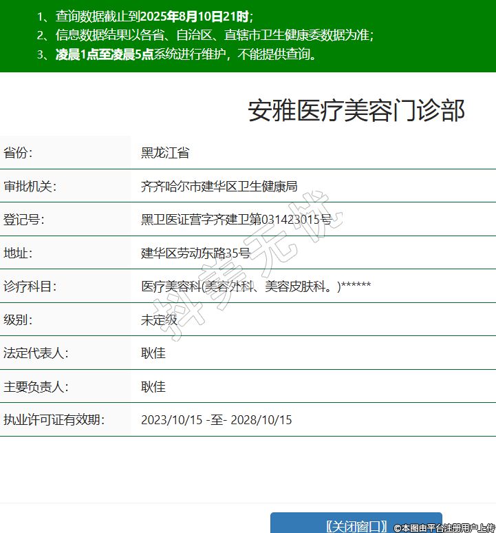 省份:黑龍江省審批機(jī)關(guān):齊齊哈爾市建華區(qū)衛(wèi)生健康局登記號(hào):黑衛(wèi)醫(yī)證營字齊建衛(wèi)第031423015號(hào)地址:建華區(qū)勞動(dòng)?xùn)|路35號(hào)診療科目:醫(yī)療美容科(美容外科、美容皮膚科。)******級(jí)別:未定級(jí)法定代表人:耿佳主要負(fù)責(zé)人:耿佳執(zhí)業(yè)許可證有效期:2023/10/15 -至- 2028/10/15 -