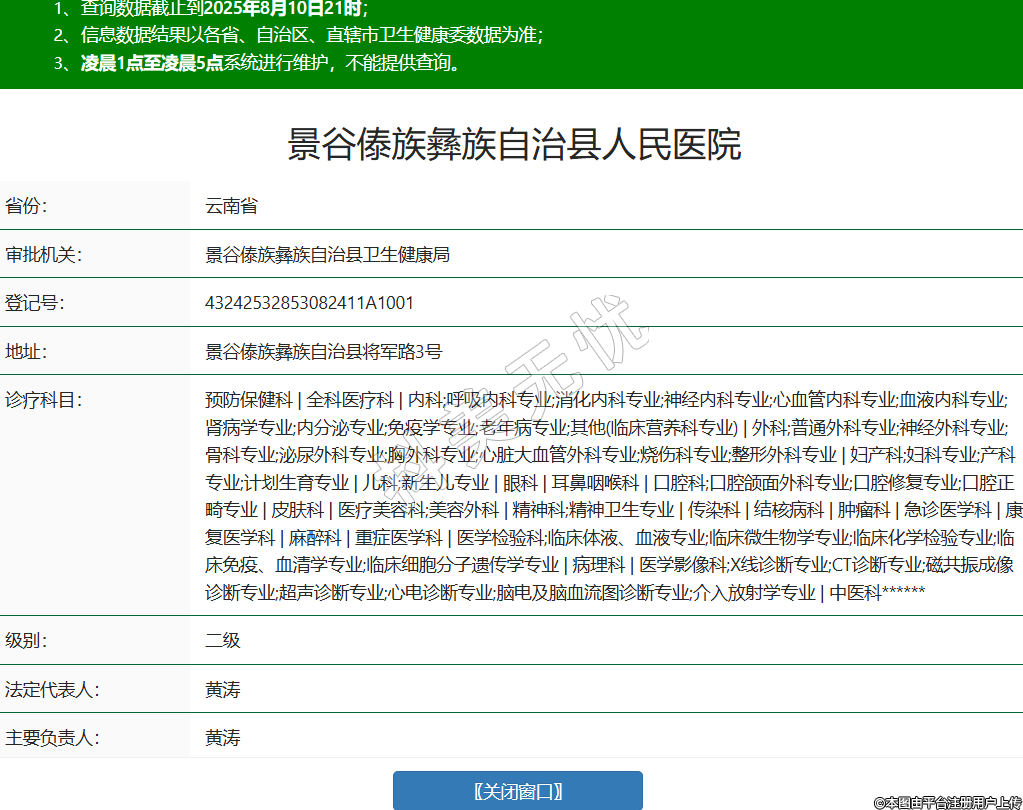 省份:云南省審批機關:景谷傣族彝族自治縣衛(wèi)生健康局登記號:43242532853082411A1001地址:景谷傣族彝族自治縣將軍路3號診療科目:預防保健科 | 全科醫(yī)療科 | 內(nèi)科;呼吸內(nèi)科專業(yè);消化內(nèi)科專業(yè);神經(jīng)內(nèi)科專業(yè);心血管內(nèi)科專業(yè);血液內(nèi)科專業(yè);腎病學專業(yè);內(nèi)分泌專業(yè);免疫學專業(yè);老年病專業(yè);其他(臨床營養(yǎng)科專業(yè)) | 外科;普通外科專業(yè);神經(jīng)外科專業(yè);骨科專業(yè);泌尿外科專業(yè);胸外科專業(yè);心臟大血管外科專業(yè);燒傷科專業(yè);整形外科專業(yè) | 婦產(chǎn)科;婦科專業(yè);產(chǎn)科專業(yè);計劃生育專業(yè) | 兒科;新生兒專業(yè) | 眼科 | 耳鼻咽喉科 | 口腔科;口腔頜面外科專業(yè);口腔修復專業(yè);口腔正畸專業(yè) | 皮膚科 | 醫(yī)療美容科;美容外科 | 精神科;精神衛(wèi)生專業(yè) | 傳染科 | 結核病科 | 腫瘤科 | 急診醫(yī)學科 | 康復醫(yī)學科 | 麻醉科 | 重癥醫(yī)學科 | 醫(yī)學檢驗科;臨床體液、血液專業(yè);臨床微生物學專業(yè);臨床化學檢驗專業(yè);臨床免疫、血清學專業(yè);臨床細胞分子遺傳學專業(yè) | 病理科 | 醫(yī)學影像科;X線診斷專業(yè);CT診斷專業(yè);磁共振成像診斷專業(yè);超聲診斷專業(yè);心電診斷專業(yè);腦電及腦血流圖診斷專業(yè);介入放射學專業(yè) | 中醫(yī)科******級別:二級法定代表人:黃濤主要負責人:黃濤執(zhí)業(yè)許可證有效期:2023/12/10 -至- 2038/12/09 -