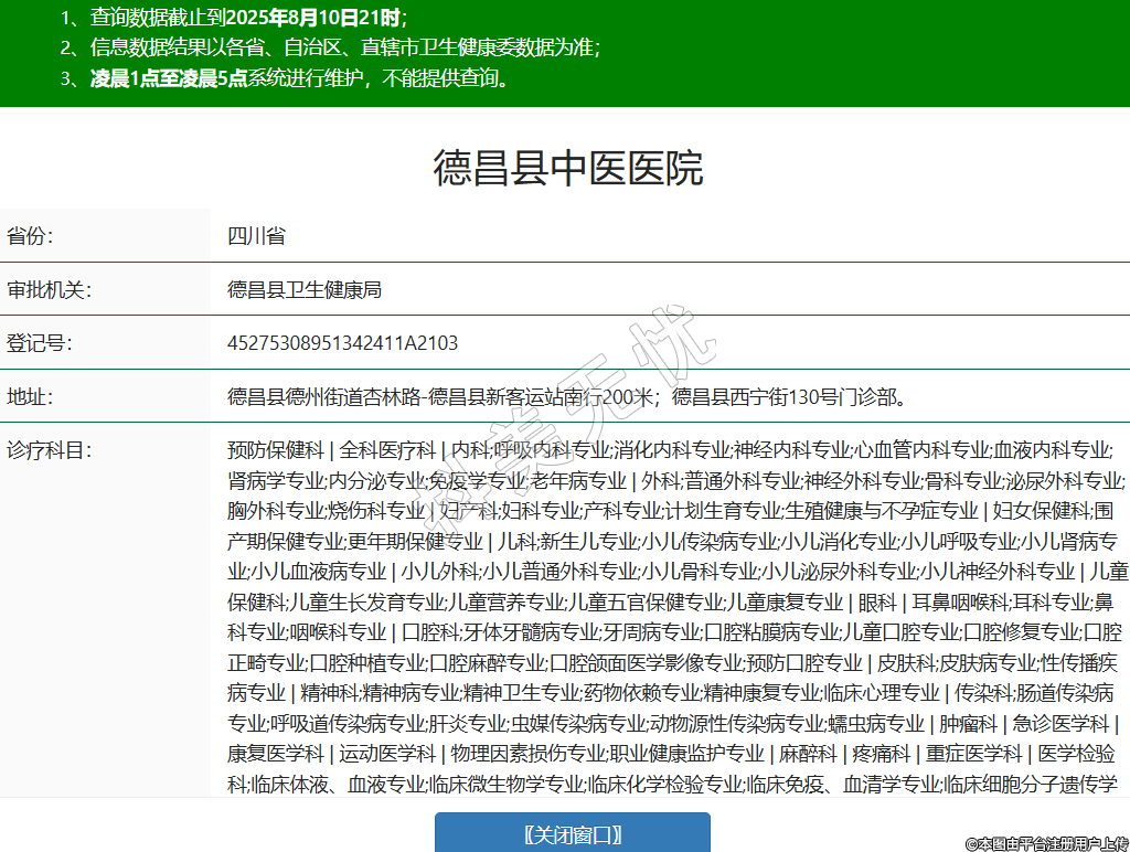 省份:四川省審批機關(guān):德昌縣衛(wèi)生健康局登記號:45275308951342411A2103地址:德昌縣德州街道杏林路-德昌縣新客運站南行200米;德昌縣西寧街130號門診部。診療科目:預(yù)防保健科 | 全科醫(yī)療科 | 內(nèi)科;呼吸內(nèi)科專業(yè);消化內(nèi)科專業(yè);神經(jīng)內(nèi)科專業(yè);心血管內(nèi)科專業(yè);血液內(nèi)科專業(yè);腎病學(xué)專業(yè);內(nèi)分泌專業(yè);免疫學(xué)專業(yè);老年病專業(yè) | 外科;普通外科專業(yè);神經(jīng)外科專業(yè);骨科專業(yè);泌尿外科專業(yè);胸外科專業(yè);燒傷科專業(yè) | 婦產(chǎn)科;婦科專業(yè);產(chǎn)科專業(yè);計劃生育專業(yè);生殖健康與不孕癥專業(yè) | 婦女保健科;圍產(chǎn)期保健專業(yè);更年期保健專業(yè) | 兒科;新生兒專業(yè);小兒傳染病專業(yè);小兒消化專業(yè);小兒呼吸專業(yè);小兒腎病專業(yè);小兒血液病專業(yè) | 小兒外科;小兒普通外科專業(yè);小兒骨科專業(yè);小兒泌尿外科專業(yè);小兒神經(jīng)外科專業(yè) | 兒童保健科;兒童生長發(fā)育專業(yè);兒童營養(yǎng)專業(yè);兒童五官保健專業(yè);兒童康復(fù)專業(yè) | 眼科 | 耳鼻咽喉科;耳科專業(yè);鼻科專業(yè);咽喉科專業(yè) | 口腔科;牙體牙髓病專業(yè);牙周病專業(yè);口腔粘膜病專業(yè);兒童口腔專業(yè);口腔修復(fù)專業(yè);口腔正畸專業(yè);口腔種植專業(yè);口腔麻醉專業(yè);口腔頜面醫(yī)學(xué)影像專業(yè);預(yù)防口腔專業(yè) | 皮膚科;皮膚病專業(yè);性傳播疾病專業(yè) | 精神科;精神病專業(yè);精神衛(wèi)生專業(yè);藥物依賴專業(yè);精神康復(fù)專業(yè);臨床心理專業(yè) | 傳染科;腸道傳染病專業(yè);呼吸道傳染病專業(yè);肝炎專業(yè);蟲媒傳染病專業(yè);動物源性傳染病專業(yè);蠕蟲病專業(yè) | 腫瘤科 | 急診醫(yī)學(xué)科 | 康復(fù)醫(yī)學(xué)科 | 運動醫(yī)學(xué)科 | 物理因素?fù)p傷專業(yè);職業(yè)健康監(jiān)護專業(yè) | 麻醉科 | 疼痛科 | 重癥醫(yī)學(xué)科 | 醫(yī)學(xué)檢驗科;臨床體液、血液專業(yè);臨床微生物學(xué)專業(yè);臨床化學(xué)檢驗專業(yè);臨床免疫、血清學(xué)專業(yè);臨床細(xì)胞分子遺傳學(xué)專業(yè) | 病理科 | 醫(yī)學(xué)影像科;X線診斷專業(yè);CT診斷專業(yè);磁共振成像診斷專業(yè);超聲診斷專業(yè);心電診斷專業(yè);腦電及腦血流圖診斷專業(yè);介入放射學(xué)專業(yè) | 中醫(yī)科;內(nèi)科專業(yè);外科專業(yè);婦產(chǎn)科專業(yè);兒科專業(yè);皮膚科專業(yè);眼科專業(yè);耳鼻咽喉科專業(yè);口腔科專業(yè);腫瘤科專業(yè);骨傷科專業(yè);肛腸科專業(yè);老年病科專業(yè);針灸科專業(yè);推拿科專業(yè);康復(fù)醫(yī)學(xué)專業(yè);急診科專業(yè);預(yù)防保健科專業(yè) | 中西醫(yī)結(jié)合科******級別:三級法定代表人:何祥飛主要負(fù)責(zé)人:何祥飛執(zhí)業(yè)許可證有效期:2024/09/03 -至- 2025/12/30 -
