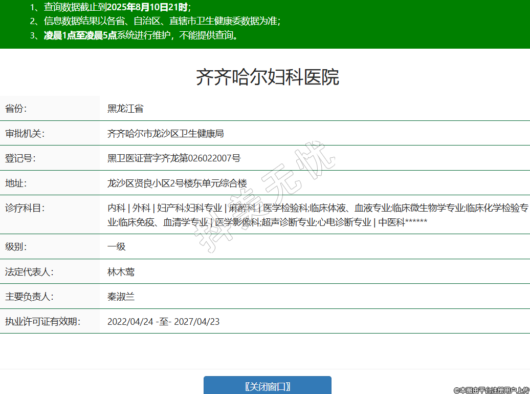 省份:黑龍江省審批機(jī)關(guān):齊齊哈爾市龍沙區(qū)衛(wèi)生健康局登記號(hào):黑衛(wèi)醫(yī)證營字齊龍第026022007號(hào)地址:龍沙區(qū)賢良小區(qū)2號(hào)樓東單元綜合樓診療科目:內(nèi)科 | 外科 | 婦產(chǎn)科;婦科專業(yè) | 麻醉科 | 醫(yī)學(xué)檢驗(yàn)科;臨床體液、血液專業(yè);臨床微生物學(xué)專業(yè);臨床化學(xué)檢驗(yàn)專業(yè);臨床免疫、血清學(xué)專業(yè) | 醫(yī)學(xué)影像科;超聲診斷專業(yè);心電診斷專業(yè) | 中醫(yī)科******級(jí)別:一級(jí)法定代表人:林木鶯主要負(fù)責(zé)人:秦淑蘭執(zhí)業(yè)許可證有效期:2022/04/24 -至- 2027/04/23 -