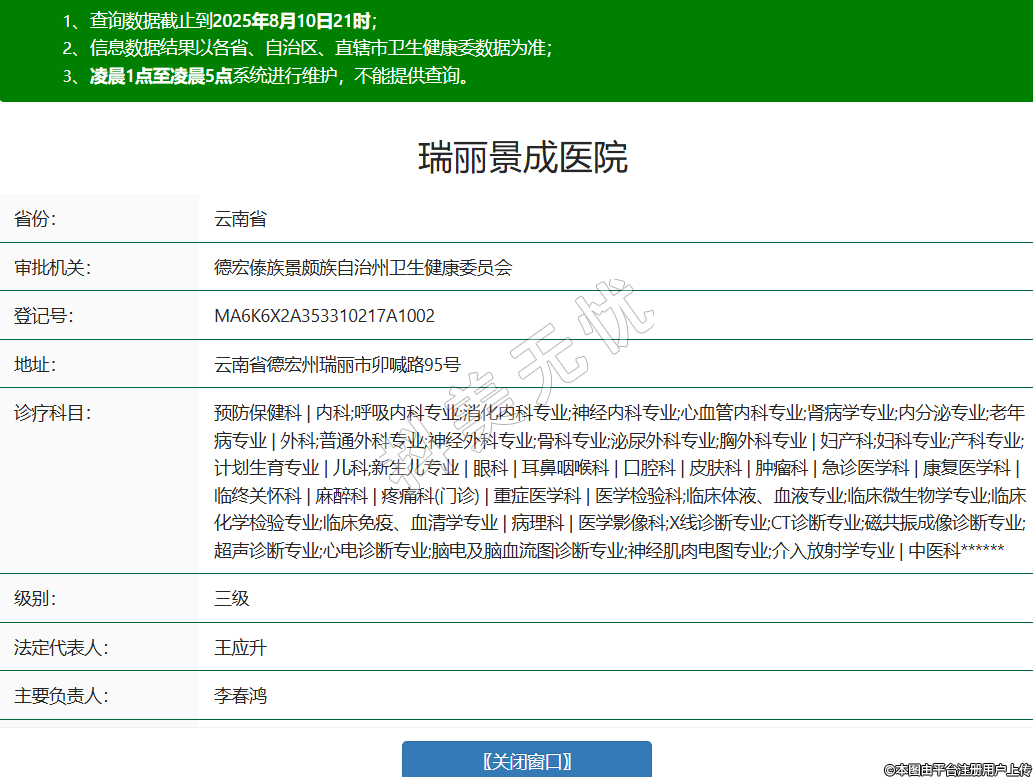 省份:云南省審批機(jī)關(guān):德宏傣族景頗族自治州衛(wèi)生健康委員會(huì)登記號(hào):MA6K6X2A353310217A1002地址:云南省德宏州瑞麗市卯喊路95號(hào)診療科目:預(yù)防保健科 | 內(nèi)科;呼吸內(nèi)科專業(yè);消化內(nèi)科專業(yè);神經(jīng)內(nèi)科專業(yè);心血管內(nèi)科專業(yè);腎病學(xué)專業(yè);內(nèi)分泌專業(yè);老年病專業(yè) | 外科;普通外科專業(yè);神經(jīng)外科專業(yè);骨科專業(yè);泌尿外科專業(yè);胸外科專業(yè) | 婦產(chǎn)科;婦科專業(yè);產(chǎn)科專業(yè);計(jì)劃生育專業(yè) | 兒科;新生兒專業(yè) | 眼科 | 耳鼻咽喉科 | 口腔科 | 皮膚科 | 腫瘤科 | 急診醫(yī)學(xué)科 | 康復(fù)醫(yī)學(xué)科 | 臨終關(guān)懷科 | 麻醉科 | 疼痛科(門診) | 重癥醫(yī)學(xué)科 | 醫(yī)學(xué)檢驗(yàn)科;臨床體液、血液專業(yè);臨床微生物學(xué)專業(yè);臨床化學(xué)檢驗(yàn)專業(yè);臨床免疫、血清學(xué)專業(yè) | 病理科 | 醫(yī)學(xué)影像科;X線診斷專業(yè);CT診斷專業(yè);磁共振成像診斷專業(yè);超聲診斷專業(yè);心電診斷專業(yè);腦電及腦血流圖診斷專業(yè);神經(jīng)肌肉電圖專業(yè);介入放射學(xué)專業(yè) | 中醫(yī)科******級(jí)別:三級(jí)法定代表人:王應(yīng)升主要負(fù)責(zé)人:李春鴻執(zhí)業(yè)許可證有效期:2022/10/21 -至- 2033/09/11 -