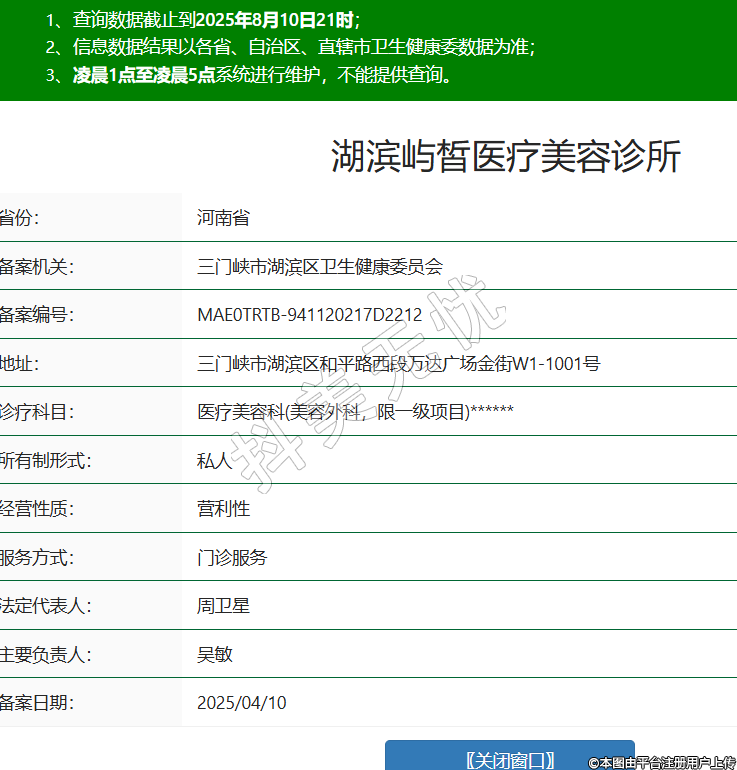 省份:河南省備案機(jī)關(guān):三門(mén)峽市湖濱區(qū)衛(wèi)生健康委員會(huì)備案編號(hào):MAE0TRTB-941120217D2212地址:三門(mén)峽市湖濱區(qū)和平路西段萬(wàn)達(dá)廣場(chǎng)金街W1-1001號(hào)診療科目:醫(yī)療美容科(美容外科,限一級(jí)項(xiàng)目)******所有制形式:私人經(jīng)營(yíng)性質(zhì):營(yíng)利性服務(wù)方式:門(mén)診服務(wù)法定代表人:周衛(wèi)星主要負(fù)責(zé)人:吳敏備案日期:2025/04/10 -