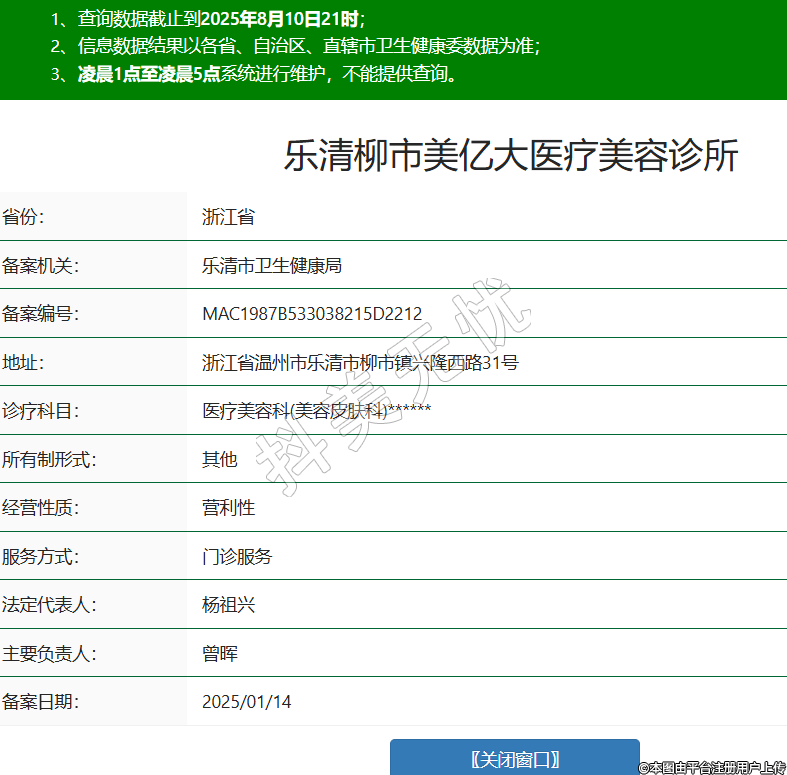 省份:浙江省備案機關(guān):樂清市衛(wèi)生健康局備案編號:MAC1987B533038215D2212地址:浙江省溫州市樂清市柳市鎮(zhèn)興隆西路31號診療科目:醫(yī)療美容科(美容皮膚科)******所有制形式:其他經(jīng)營性質(zhì):營利性服務(wù)方式:門診服務(wù)法定代表人:楊祖興主要負責人:曾暉備案日期:2025/01/14 -