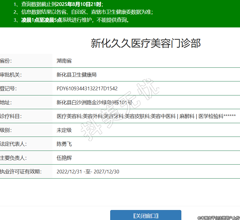 省份:湖南省審批機(jī)關(guān):新化縣衛(wèi)生健康局登記號:PDY61093443132217D1542地址:新化縣白沙洲路金沙綠島9棟101號診療科目:醫(yī)療美容科;美容外科;美容牙科;美容皮膚科;美容中醫(yī)科 | 麻醉科 | 醫(yī)學(xué)檢驗(yàn)科******級別:未定級法定代表人:陳勇飛主要負(fù)責(zé)人:伍艷輝執(zhí)業(yè)許可證有效期:2022/12/31 -至- 2027/12/30 -