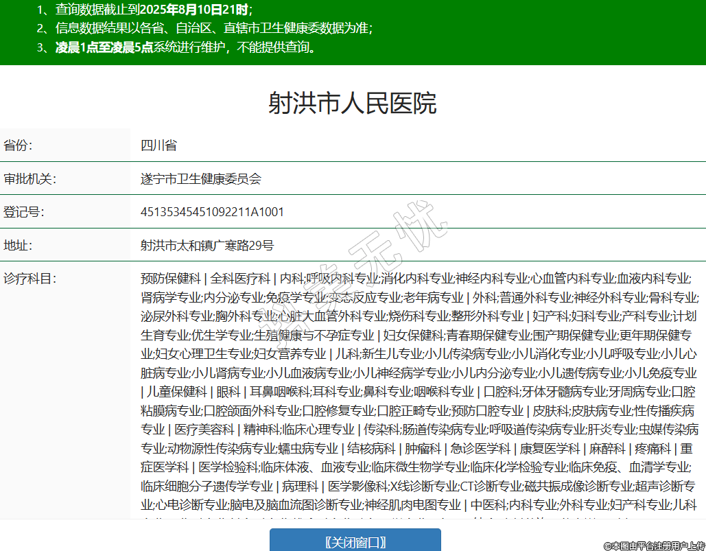 省份:四川省審批機關:遂寧市衛(wèi)生健康委員會登記號:45135345451092211A1001地址:射洪市太和鎮(zhèn)廣寒路29號診療科目:預防保健科 | 全科醫(yī)療科 | 內(nèi)科;呼吸內(nèi)科專業(yè);消化內(nèi)科專業(yè);神經(jīng)內(nèi)科專業(yè);心血管內(nèi)科專業(yè);血液內(nèi)科專業(yè);腎病學專業(yè);內(nèi)分泌專業(yè);免疫學專業(yè);變態(tài)反應專業(yè);老年病專業(yè) | 外科;普通外科專業(yè);神經(jīng)外科專業(yè);骨科專業(yè);泌尿外科專業(yè);胸外科專業(yè);心臟大血管外科專業(yè);燒傷科專業(yè);整形外科專業(yè) | 婦產(chǎn)科;婦科專業(yè);產(chǎn)科專業(yè);計劃生育專業(yè);優(yōu)生學專業(yè);生殖健康與不孕癥專業(yè) | 婦女保健科;青春期保健專業(yè);圍產(chǎn)期保健專業(yè);更年期保健專業(yè);婦女心理衛(wèi)生專業(yè);婦女營養(yǎng)專業(yè) | 兒科;新生兒專業(yè);小兒傳染病專業(yè);小兒消化專業(yè);小兒呼吸專業(yè);小兒心臟病專業(yè);小兒腎病專業(yè);小兒血液病專業(yè);小兒神經(jīng)病學專業(yè);小兒內(nèi)分泌專業(yè);小兒遺傳病專業(yè);小兒免疫專業(yè) | 兒童保健科 | 眼科 | 耳鼻咽喉科;耳科專業(yè);鼻科專業(yè);咽喉科專業(yè) | 口腔科;牙體牙髓病專業(yè);牙周病專業(yè);口腔粘膜病專業(yè);口腔頜面外科專業(yè);口腔修復專業(yè);口腔正畸專業(yè);預防口腔專業(yè) | 皮膚科;皮膚病專業(yè);性傳播疾病專業(yè) | 醫(yī)療美容科 | 精神科;臨床心理專業(yè) | 傳染科;腸道傳染病專業(yè);呼吸道傳染病專業(yè);肝炎專業(yè);蟲媒傳染病專業(yè);動物源性傳染病專業(yè);蠕蟲病專業(yè) | 結核病科 | 腫瘤科 | 急診醫(yī)學科 | 康復醫(yī)學科 | 麻醉科 | 疼痛科 | 重癥醫(yī)學科 | 醫(yī)學檢驗科;臨床體液、血液專業(yè);臨床微生物學專業(yè);臨床化學檢驗專業(yè);臨床免疫、血清學專業(yè);臨床細胞分子遺傳學專業(yè) | 病理科 | 醫(yī)學影像科;X線診斷專業(yè);CT診斷專業(yè);磁共振成像診斷專業(yè);超聲診斷專業(yè);心電診斷專業(yè);腦電及腦血流圖診斷專業(yè);神經(jīng)肌肉電圖專業(yè) | 中醫(yī)科;內(nèi)科專業(yè);外科專業(yè);婦產(chǎn)科專業(yè);兒科專業(yè);骨傷科專業(yè);針灸科專業(yè);推拿科專業(yè);康復醫(yī)學專業(yè) | 中西醫(yī)結合科(其他許可信息詳見副本)******級別:三級法定代表人:謝莉主要負責人:謝莉執(zhí)業(yè)許可證有效期:2011/01/01 -至- 2025/12/31 -