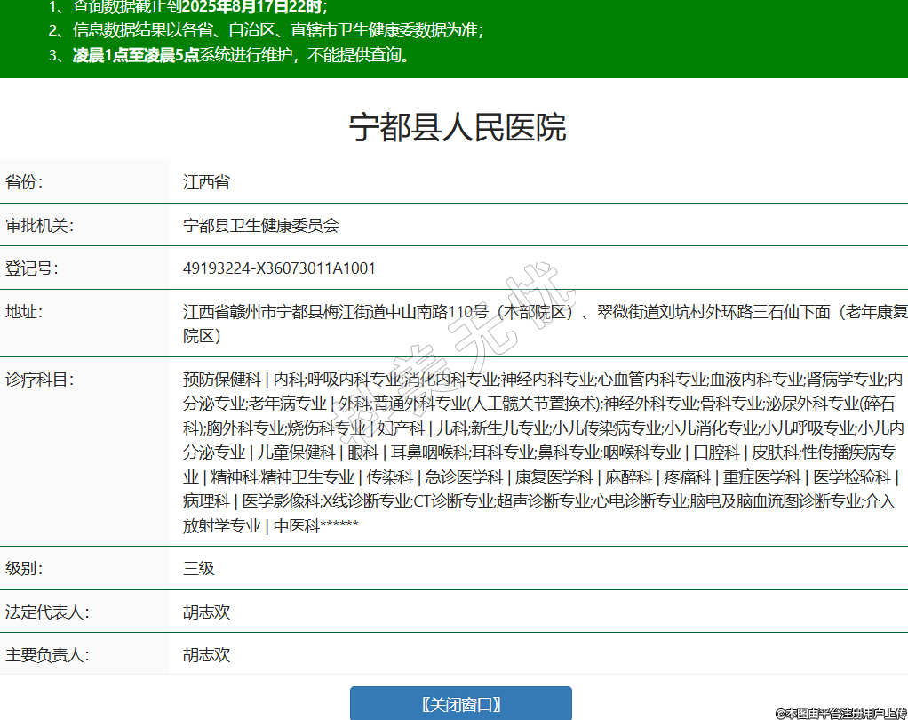 省份:江西省審批機(jī)關(guān):寧都縣衛(wèi)生健康委員會(huì)登記號(hào):49193224-X36073011A1001地址:江西省贛州市寧都縣梅江街道中山南路110號(hào)(本部院區(qū))、翠微街道劉坑村外環(huán)路三石仙下面(老年康復(fù)院區(qū))診療科目:預(yù)防保健科 | 內(nèi)科;呼吸內(nèi)科專業(yè);消化內(nèi)科專業(yè);神經(jīng)內(nèi)科專業(yè);心血管內(nèi)科專業(yè);血液內(nèi)科專業(yè);腎病學(xué)專業(yè);內(nèi)分泌專業(yè);老年病專業(yè) | 外科;普通外科專業(yè)(人工髖關(guān)節(jié)置換術(shù));神經(jīng)外科專業(yè);骨科專業(yè);泌尿外科專業(yè)(碎石科);胸外科專業(yè);燒傷科專業(yè) | 婦產(chǎn)科 | 兒科;新生兒專業(yè);小兒傳染病專業(yè);小兒消化專業(yè);小兒呼吸專業(yè);小兒內(nèi)分泌專業(yè) | 兒童保健科 | 眼科 | 耳鼻咽喉科;耳科專業(yè);鼻科專業(yè);咽喉科專業(yè) | 口腔科 | 皮膚科;性傳播疾病專業(yè) | 精神科;精神衛(wèi)生專業(yè) | 傳染科 | 急診醫(yī)學(xué)科 | 康復(fù)醫(yī)學(xué)科 | 麻醉科 | 疼痛科 | 重癥醫(yī)學(xué)科 | 醫(yī)學(xué)檢驗(yàn)科 | 病理科 | 醫(yī)學(xué)影像科;X線診斷專業(yè);CT診斷專業(yè);超聲診斷專業(yè);心電診斷專業(yè);腦電及腦血流圖診斷專業(yè);介入放射學(xué)專業(yè) | 中醫(yī)科******級(jí)別:三級(jí)法定代表人:胡志歡主要負(fù)責(zé)人:胡志歡執(zhí)業(yè)許可證有效期:2025/08/01 -至- 2028/07/31 -