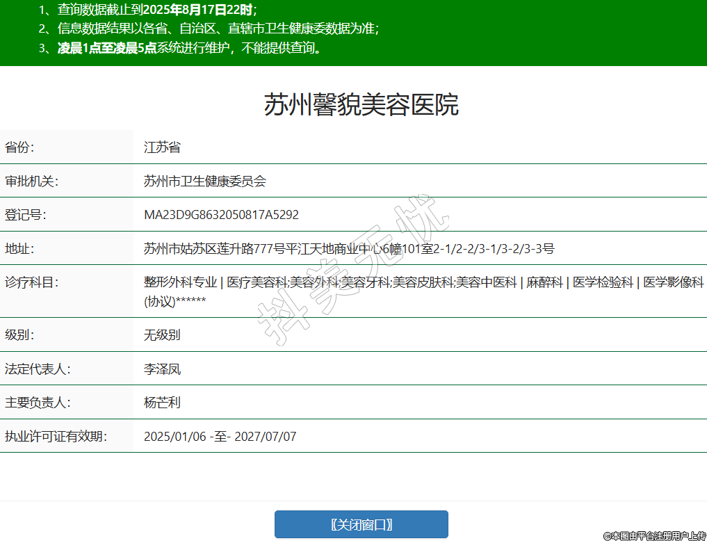 蘇州馨貌美容醫(yī)院,診療科目:整形外科專業(yè) | 醫(yī)療美容科;美容外科;美容牙科;美容皮膚科;美容中醫(yī)科 | 麻醉科 | 醫(yī)學(xué)檢驗(yàn)科 | 醫(yī)學(xué)影像科(協(xié)議)******