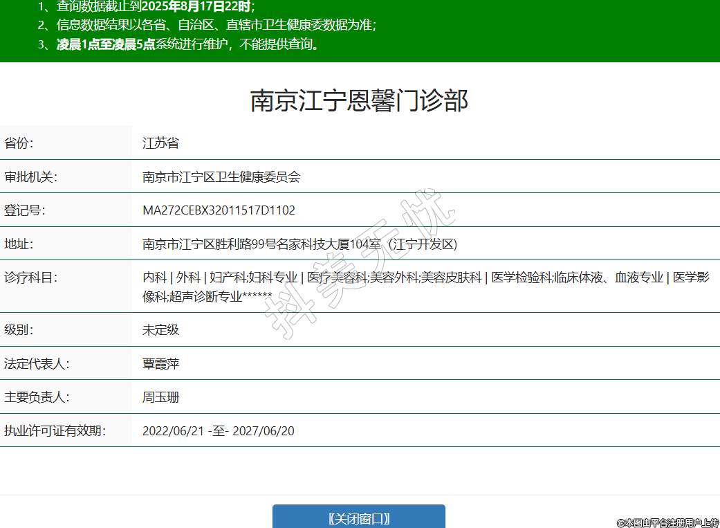 南京江寧恩馨門診部,診療科目:內(nèi)科 | 外科 | 婦產(chǎn)科;婦科專業(yè) | 醫(yī)療美容科;美容外科;美容皮膚科 | 醫(yī)學(xué)檢驗科;臨床體液、血液專業(yè) | 醫(yī)學(xué)影像科;超聲診斷專業(yè)******