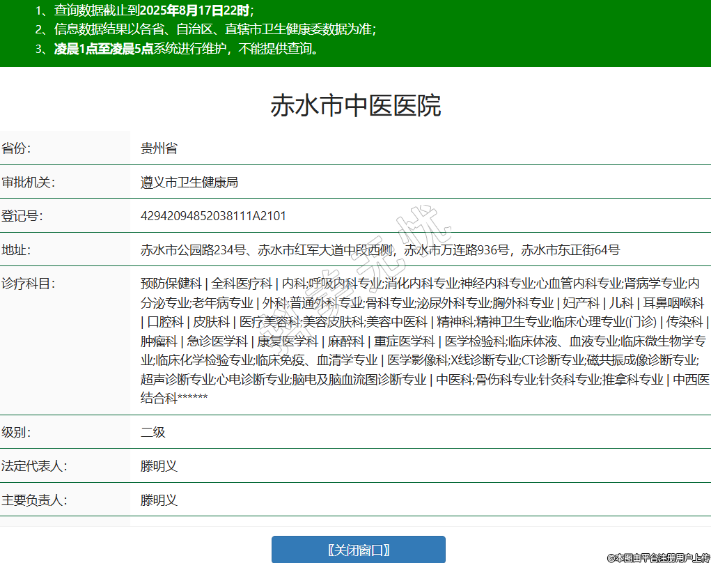 省份:貴州省審批機(jī)關(guān):遵義市衛(wèi)生健康局登記號(hào):42942094852038111A2101地址:赤水市公園路234號(hào)、赤水市紅軍大道中段西側(cè),赤水市萬(wàn)連路936號(hào),赤水市東正街64號(hào)診療科目:預(yù)防保健科 | 全科醫(yī)療科 | 內(nèi)科;呼吸內(nèi)科專業(yè);消化內(nèi)科專業(yè);神經(jīng)內(nèi)科專業(yè);心血管內(nèi)科專業(yè);腎病學(xué)專業(yè);內(nèi)分泌專業(yè);老年病專業(yè) | 外科;普通外科專業(yè);骨科專業(yè);泌尿外科專業(yè);胸外科專業(yè) | 婦產(chǎn)科 | 兒科 | 耳鼻咽喉科 | 口腔科 | 皮膚科 | 醫(yī)療美容科;美容皮膚科;美容中醫(yī)科 | 精神科;精神衛(wèi)生專業(yè);臨床心理專業(yè)(門診) | 傳染科 | 腫瘤科 | 急診醫(yī)學(xué)科 | 康復(fù)醫(yī)學(xué)科 | 麻醉科 | 重癥醫(yī)學(xué)科 | 醫(yī)學(xué)檢驗(yàn)科;臨床體液、血液專業(yè);臨床微生物學(xué)專業(yè);臨床化學(xué)檢驗(yàn)專業(yè);臨床免疫、血清學(xué)專業(yè) | 醫(yī)學(xué)影像科;X線診斷專業(yè);CT診斷專業(yè);磁共振成像診斷專業(yè);超聲診斷專業(yè);心電診斷專業(yè);腦電及腦血流圖診斷專業(yè) | 中醫(yī)科;骨傷科專業(yè);針灸科專業(yè);推拿科專業(yè) | 中西醫(yī)結(jié)合科******級(jí)別:二級(jí)法定代表人:滕明義主要負(fù)責(zé)人:滕明義執(zhí)業(yè)許可證有效期:2014/05/01 -至- 2029/04/30 -