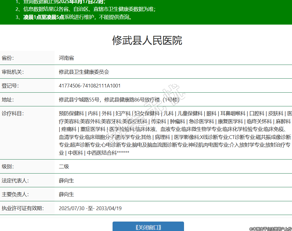 省份:河南省審批機(jī)關(guān):修武縣衛(wèi)生健康委員會登記號:41774506-741082111A1001地址:修武縣寧城路55號,修武縣健康路86號放療樓(1號樓)診療科目:預(yù)防保健科 | 內(nèi)科 | 外科 | 婦產(chǎn)科 | 婦女保健科 | 兒科 | 兒童保健科 | 眼科 | 耳鼻咽喉科 | 口腔科 | 皮膚科 | 醫(yī)療美容科;美容外科;美容牙科;美容皮膚科 | 傳染科 | 腫瘤科 | 急診醫(yī)學(xué)科 | 康復(fù)醫(yī)學(xué)科 | 臨終關(guān)懷科 | 麻醉科 | 疼痛科 | 重癥醫(yī)學(xué)科 | 醫(yī)學(xué)檢驗科;臨床體液、血液專業(yè);臨床微生物學(xué)專業(yè);臨床化學(xué)檢驗專業(yè);臨床免疫、血清學(xué)專業(yè);臨床細(xì)胞分子遺傳學(xué)專業(yè);其他 | 病理科 | 醫(yī)學(xué)影像科;X線診斷專業(yè);CT診斷專業(yè);磁共振成像診斷專業(yè);超聲診斷專業(yè);心電診斷專業(yè);腦電及腦血流圖診斷專業(yè);神經(jīng)肌肉電圖專業(yè);介入放射學(xué)專業(yè);放射治療專業(yè) | 中醫(yī)科 | 中西醫(yī)結(jié)合科******級別:二級法定代表人:薛向生主要負(fù)責(zé)人:薛向生執(zhí)業(yè)許可證有效期:2025/07/30 -至- 2033/04/19 -