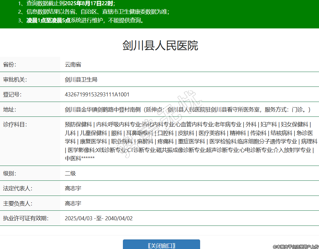 省份:云南省審批機關(guān):劍川縣衛(wèi)生局登記號:43267199153293111A1001地址:劍川縣金華鎮(zhèn)劍鶴路中登村南側(cè)(延伸點:劍川縣人民醫(yī)院駐劍川縣看守所醫(yī)務(wù)室,服務(wù)方式:門診。)診療科目:預(yù)防保健科 | 內(nèi)科;呼吸內(nèi)科專業(yè);消化內(nèi)科專業(yè);心血管內(nèi)科專業(yè);老年病專業(yè) | 外科 | 婦產(chǎn)科 | 婦女保健科 | 兒科 | 兒童保健科 | 眼科 | 耳鼻咽喉科 | 口腔科 | 皮膚科 | 醫(yī)療美容科 | 精神科 | 傳染科 | 結(jié)核病科 | 急診醫(yī)學(xué)科 | 康復(fù)醫(yī)學(xué)科 | 職業(yè)病科 | 麻醉科 | 疼痛科 | 重癥醫(yī)學(xué)科 | 醫(yī)學(xué)檢驗科;臨床細(xì)胞分子遺傳學(xué)專業(yè) | 病理科 | 醫(yī)學(xué)影像科;X線診斷專業(yè);CT診斷專業(yè);磁共振成像診斷專業(yè);超聲診斷專業(yè);心電診斷專業(yè);介入放射學(xué)專業(yè) | 中醫(yī)科******級別:二級法定代表人:高志宇主要負(fù)責(zé)人:高志宇執(zhí)業(yè)許可證有效期:2025/04/03 -至- 2040/04/02 -
