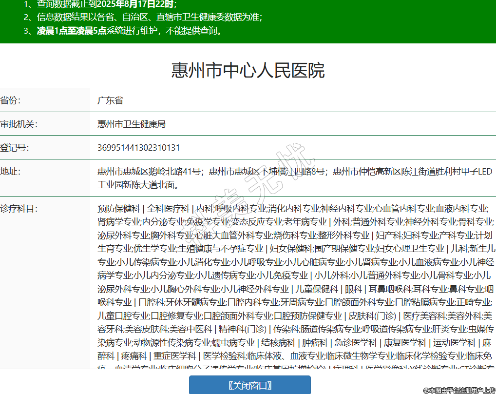 省份:廣東省審批機(jī)關(guān):惠州市衛(wèi)生健康局登記號(hào):369951441302310131地址:惠州市惠城區(qū)鵝嶺北路41號(hào);惠州市惠城區(qū)下埔橫江四路8號(hào);惠州市仲愷高新區(qū)陳江街道勝利村甲子LED工業(yè)園新陳大道北面。診療科目:預(yù)防保健科 | 全科醫(yī)療科 | 內(nèi)科;呼吸內(nèi)科專業(yè);消化內(nèi)科專業(yè);神經(jīng)內(nèi)科專業(yè);心血管內(nèi)科專業(yè);血液內(nèi)科專業(yè);腎病學(xué)專業(yè);內(nèi)分泌專業(yè);免疫學(xué)專業(yè);變態(tài)反應(yīng)專業(yè);老年病專業(yè) | 外科;普通外科專業(yè);神經(jīng)外科專業(yè);骨科專業(yè);泌尿外科專業(yè);胸外科專業(yè);心臟大血管外科專業(yè);燒傷科專業(yè);整形外科專業(yè) | 婦產(chǎn)科;婦科專業(yè);產(chǎn)科專業(yè);計(jì)劃生育專業(yè);優(yōu)生學(xué)專業(yè);生殖健康與不孕癥專業(yè) | 婦女保健科;圍產(chǎn)期保健專業(yè);婦女心理衛(wèi)生專業(yè) | 兒科;新生兒專業(yè);小兒傳染病專業(yè);小兒消化專業(yè);小兒呼吸專業(yè);小兒心臟病專業(yè);小兒腎病專業(yè);小兒血液病專業(yè);小兒神經(jīng)病學(xué)專業(yè);小兒內(nèi)分泌專業(yè);小兒遺傳病專業(yè);小兒免疫專業(yè) | 小兒外科;小兒普通外科專業(yè);小兒骨科專業(yè);小兒泌尿外科專業(yè);小兒胸心外科專業(yè);小兒神經(jīng)外科專業(yè) | 兒童保健科 | 眼科 | 耳鼻咽喉科;耳科專業(yè);鼻科專業(yè);咽喉科專業(yè) | 口腔科;牙體牙髓病專業(yè);口腔內(nèi)科專業(yè);牙周病專業(yè);口腔頜面外科專業(yè);口腔粘膜病專業(yè);正畸專業(yè);兒童口腔專業(yè);口腔修復(fù)專業(yè);口腔頜面外科專業(yè);口腔預(yù)防保健專業(yè) | 皮膚科(門診) | 醫(yī)療美容科;美容外科;美容牙科;美容皮膚科;美容中醫(yī)科 | 精神科(門診) | 傳染科;腸道傳染病專業(yè);呼吸道傳染病專業(yè);肝炎專業(yè);蟲(chóng)媒傳染病專業(yè);動(dòng)物源性傳染病專業(yè);蠕蟲(chóng)病專業(yè) | 結(jié)核病科 | 腫瘤科 | 急診醫(yī)學(xué)科 | 康復(fù)醫(yī)學(xué)科 | 運(yùn)動(dòng)醫(yī)學(xué)科 | 麻醉科 | 疼痛科 | 重癥醫(yī)學(xué)科 | 醫(yī)學(xué)檢驗(yàn)科;臨床體液、血液專業(yè);臨床微生物學(xué)專業(yè);臨床化學(xué)檢驗(yàn)專業(yè);臨床免疫、血清學(xué)專業(yè);臨床細(xì)胞分子遺傳學(xué)專業(yè)(臨床基因擴(kuò)增檢驗(yàn)) | 病理科 | 醫(yī)學(xué)影像科;X線診斷專業(yè);CT診斷專業(yè);磁共振成像診斷專業(yè);核醫(yī)學(xué)專業(yè);超聲診斷專業(yè);心電診斷專業(yè);腦電及腦血流圖診斷專業(yè);神經(jīng)肌肉電圖專業(yè);介入放射學(xué)專業(yè);放射治療專業(yè) | 中醫(yī)科 | 中西醫(yī)結(jié)合科******級(jí)別:三級(jí)法定代表人:紀(jì)燕琴主要負(fù)責(zé)人:紀(jì)燕琴執(zhí)業(yè)許可證有效期:2024/03/20 -至- 2029/12/04 -