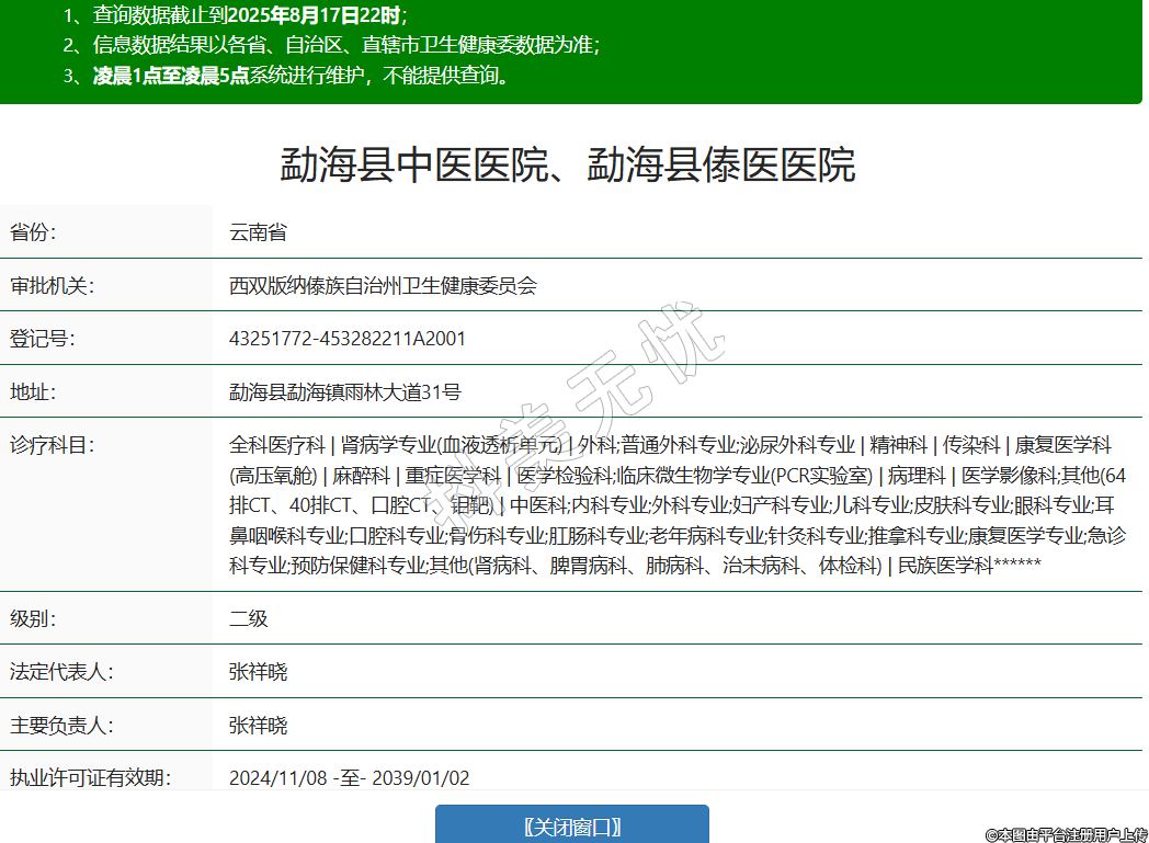 省份:云南省審批機(jī)關(guān):西雙版納傣族自治州衛(wèi)生健康委員會(huì)登記號(hào):43251772-453282211A2001地址:勐??h勐海鎮(zhèn)雨林大道31號(hào)診療科目:全科醫(yī)療科 | 腎病學(xué)專業(yè)(血液透析單元) | 外科;普通外科專業(yè);泌尿外科專業(yè) | 精神科 | 傳染科 | 康復(fù)醫(yī)學(xué)科(高壓氧艙) | 麻醉科 | 重癥醫(yī)學(xué)科 | 醫(yī)學(xué)檢驗(yàn)科;臨床微生物學(xué)專業(yè)(PCR實(shí)驗(yàn)室) | 病理科 | 醫(yī)學(xué)影像科;其他(64排CT、40排CT、口腔CT、鉬靶) | 中醫(yī)科;內(nèi)科專業(yè);外科專業(yè);婦產(chǎn)科專業(yè);兒科專業(yè);皮膚科專業(yè);眼科專業(yè);耳鼻咽喉科專業(yè);口腔科專業(yè);骨傷科專業(yè);肛腸科專業(yè);老年病科專業(yè);針灸科專業(yè);推拿科專業(yè);康復(fù)醫(yī)學(xué)專業(yè);急診科專業(yè);預(yù)防保健科專業(yè);其他(腎病科、脾胃病科、肺病科、治未病科、體檢科) | 民族醫(yī)學(xué)科******級(jí)別:二級(jí)法定代表人:張祥曉主要負(fù)責(zé)人:張祥曉執(zhí)業(yè)許可證有效期:2024/11/08 -至- 2039/01/02 -
