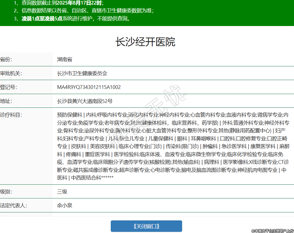 省份:湖南省審批機(jī)關(guān):長沙市衛(wèi)生健康委員會登記號:MA4R9YQ7343012115A1002地址:長沙縣黃興大道南段52號診療科目:預(yù)防保健科 | 內(nèi)科;呼吸內(nèi)科專業(yè);消化內(nèi)科專業(yè);神經(jīng)內(nèi)科專業(yè);心血管內(nèi)科專業(yè);血液內(nèi)科專業(yè);腎病學(xué)專業(yè);內(nèi)分泌專業(yè);免疫學(xué)專業(yè);老年病專業(yè);其他(健康體檢科,臨床營養(yǎng)科,藥學(xué)部) | 外科;普通外科專業(yè);神經(jīng)外科專業(yè);骨科專業(yè);泌尿外科專業(yè);胸外科專業(yè);心臟大血管外科專業(yè);整形外科專業(yè);其他(靜脈用藥配置中心) | 婦產(chǎn)科;婦科專業(yè);產(chǎn)科專業(yè) | 兒科;新生兒專業(yè) | 兒童保健科 | 眼科 | 耳鼻咽喉科 | 口腔科;口腔修復(fù)專業(yè);口腔正畸專業(yè) | 皮膚科 | 美容皮膚科 | 臨床心理專業(yè)(門診) | 傳染科(限門診) | 腫瘤科 | 急診醫(yī)學(xué)科 | 康復(fù)醫(yī)學(xué)科 | 麻醉科 | 疼痛科 | 重癥醫(yī)學(xué)科 | 醫(yī)學(xué)檢驗(yàn)科;臨床體液、血液專業(yè);臨床微生物學(xué)專業(yè);臨床化學(xué)檢驗(yàn)專業(yè);臨床免疫、血清學(xué)專業(yè);臨床細(xì)胞分子遺傳學(xué)專業(yè)(核酸檢測);其他(輸血科) | 病理科 | 醫(yī)學(xué)影像科;X線診斷專業(yè);CT診斷專業(yè);磁共振成像診斷專業(yè);超聲診斷專業(yè);心電診斷專業(yè);腦電及腦血流圖診斷專業(yè);神經(jīng)肌肉電圖專業(yè) | 中醫(yī)科 | 中西醫(yī)結(jié)合科******級別:三級法定代表人:余小泉主要負(fù)責(zé)人:易依澄執(zhí)業(yè)許可證有效期:2025/05/09 -至- 2039/08/19 -
