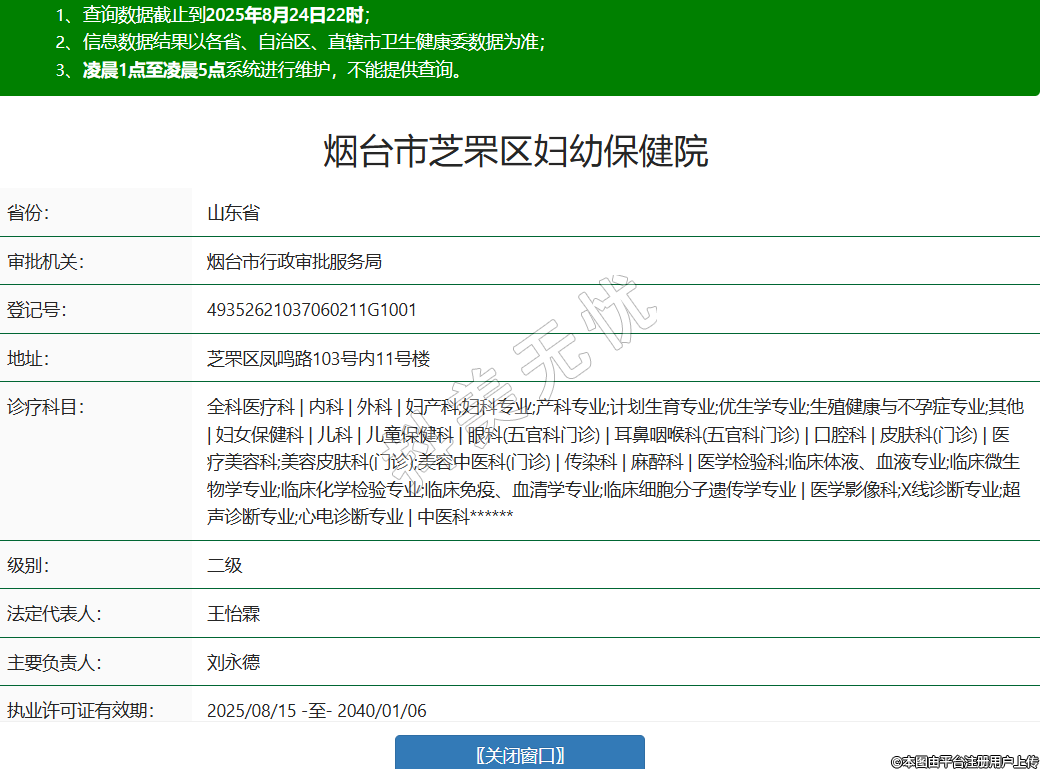 省份:山東省審批機關(guān):煙臺市行政審批服務(wù)局登記號:49352621037060211G1001地址:芝罘區(qū)鳳鳴路103號內(nèi)11號樓診療科目:全科醫(yī)療科 | 內(nèi)科 | 外科 | 婦產(chǎn)科;婦科專業(yè);產(chǎn)科專業(yè);計劃生育專業(yè);優(yōu)生學(xué)專業(yè);生殖健康與不孕癥專業(yè);其他 | 婦女保健科 | 兒科 | 兒童保健科 | 眼科(五官科門診) | 耳鼻咽喉科(五官科門診) | 口腔科 | 皮膚科(門診) | 醫(yī)療美容科;美容皮膚科(門診);美容中醫(yī)科(門診) | 傳染科 | 麻醉科 | 醫(yī)學(xué)檢驗科;臨床體液、血液專業(yè);臨床微生物學(xué)專業(yè);臨床化學(xué)檢驗專業(yè);臨床免疫、血清學(xué)專業(yè);臨床細(xì)胞分子遺傳學(xué)專業(yè) | 醫(yī)學(xué)影像科;X線診斷專業(yè);超聲診斷專業(yè);心電診斷專業(yè) | 中醫(yī)科******級別:二級法定代表人:王怡霖主要負(fù)責(zé)人:劉永德執(zhí)業(yè)許可證有效期:2025/08/15 -至- 2040/01/06 -