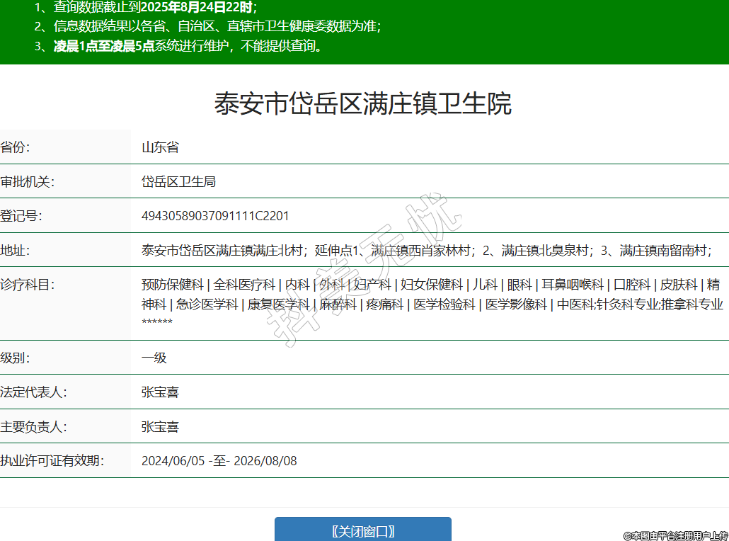 省份:山東省審批機(jī)關(guān):岱岳區(qū)衛(wèi)生局登記號(hào):49430589037091111C2201地址:泰安市岱岳區(qū)滿莊鎮(zhèn)滿莊北村;延伸點(diǎn)1、滿莊鎮(zhèn)西肖家林村;2、滿莊鎮(zhèn)北臭泉村;3、滿莊鎮(zhèn)南留南村;診療科目:預(yù)防保健科 | 全科醫(yī)療科 | 內(nèi)科 | 外科 | 婦產(chǎn)科 | 婦女保健科 | 兒科 | 眼科 | 耳鼻咽喉科 | 口腔科 | 皮膚科 | 精神科 | 急診醫(yī)學(xué)科 | 康復(fù)醫(yī)學(xué)科 | 麻醉科 | 疼痛科 | 醫(yī)學(xué)檢驗(yàn)科 | 醫(yī)學(xué)影像科 | 中醫(yī)科;針灸科專(zhuān)業(yè);推拿科專(zhuān)業(yè)******級(jí)別:一級(jí)法定代表人:張寶喜主要負(fù)責(zé)人:張寶喜執(zhí)業(yè)許可證有效期:2024/06/05 -至- 2026/08/08 -
