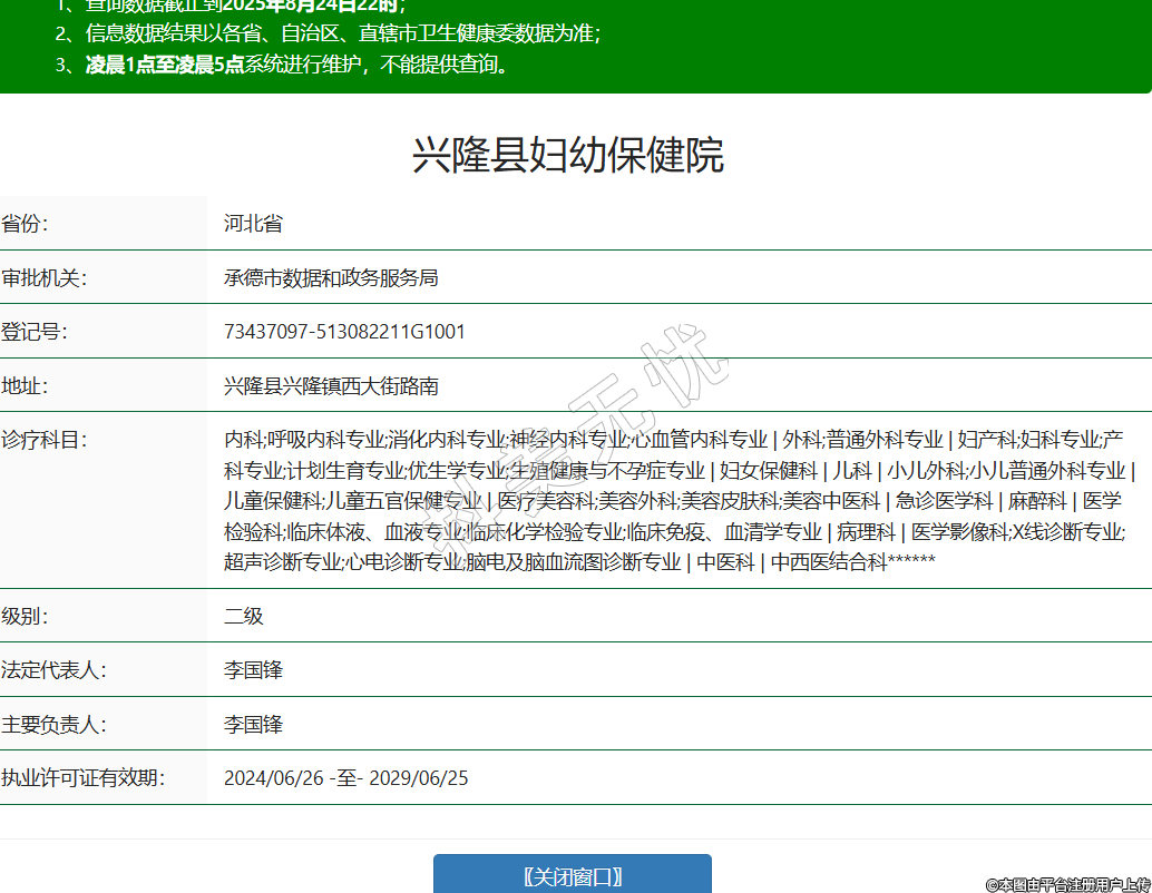 省份:河北省審批機(jī)關(guān):承德市數(shù)據(jù)和政務(wù)服務(wù)局登記號(hào):73437097-513082211G1001地址:興隆縣興隆鎮(zhèn)西大街路南診療科目:內(nèi)科;呼吸內(nèi)科專業(yè);消化內(nèi)科專業(yè);神經(jīng)內(nèi)科專業(yè);心血管內(nèi)科專業(yè) | 外科;普通外科專業(yè) | 婦產(chǎn)科;婦科專業(yè);產(chǎn)科專業(yè);計(jì)劃生育專業(yè);優(yōu)生學(xué)專業(yè);生殖健康與不孕癥專業(yè) | 婦女保健科 | 兒科 | 小兒外科;小兒普通外科專業(yè) | 兒童保健科;兒童五官保健專業(yè) | 醫(yī)療美容科;美容外科;美容皮膚科;美容中醫(yī)科 | 急診醫(yī)學(xué)科 | 麻醉科 | 醫(yī)學(xué)檢驗(yàn)科;臨床體液、血液專業(yè);臨床化學(xué)檢驗(yàn)專業(yè);臨床免疫、血清學(xué)專業(yè) | 病理科 | 醫(yī)學(xué)影像科;X線診斷專業(yè);超聲診斷專業(yè);心電診斷專業(yè);腦電及腦血流圖診斷專業(yè) | 中醫(yī)科 | 中西醫(yī)結(jié)合科******級(jí)別:二級(jí)法定代表人:李國(guó)鋒主要負(fù)責(zé)人:李國(guó)鋒執(zhí)業(yè)許可證有效期:2024/06/26 -至- 2029/06/25 -