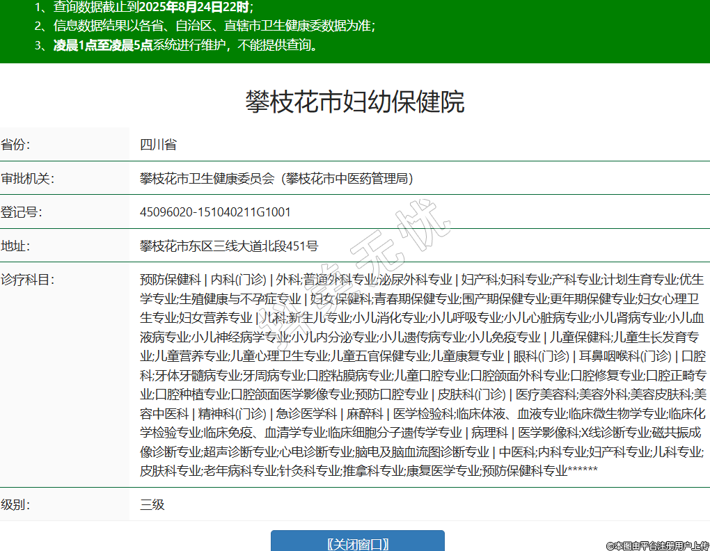 省份:四川省審批機關(guān):攀枝花市衛(wèi)生健康委員會(攀枝花市中醫(yī)藥管理局)登記號:45096020-151040211G1001地址:攀枝花市東區(qū)三線大道北段451號診療科目:預(yù)防保健科 | 內(nèi)科(門診) | 外科;普通外科專業(yè);泌尿外科專業(yè) | 婦產(chǎn)科;婦科專業(yè);產(chǎn)科專業(yè);計劃生育專業(yè);優(yōu)生學(xué)專業(yè);生殖健康與不孕癥專業(yè) | 婦女保健科;青春期保健專業(yè);圍產(chǎn)期保健專業(yè);更年期保健專業(yè);婦女心理衛(wèi)生專業(yè);婦女營養(yǎng)專業(yè) | 兒科;新生兒專業(yè);小兒消化專業(yè);小兒呼吸專業(yè);小兒心臟病專業(yè);小兒腎病專業(yè);小兒血液病專業(yè);小兒神經(jīng)病學(xué)專業(yè);小兒內(nèi)分泌專業(yè);小兒遺傳病專業(yè);小兒免疫專業(yè) | 兒童保健科;兒童生長發(fā)育專業(yè);兒童營養(yǎng)專業(yè);兒童心理衛(wèi)生專業(yè);兒童五官保健專業(yè);兒童康復(fù)專業(yè) | 眼科(門診) | 耳鼻咽喉科(門診) | 口腔科;牙體牙髓病專業(yè);牙周病專業(yè);口腔粘膜病專業(yè);兒童口腔專業(yè);口腔頜面外科專業(yè);口腔修復(fù)專業(yè);口腔正畸專業(yè);口腔種植專業(yè);口腔頜面醫(yī)學(xué)影像專業(yè);預(yù)防口腔專業(yè) | 皮膚科(門診) | 醫(yī)療美容科;美容外科;美容皮膚科;美容中醫(yī)科 | 精神科(門診) | 急診醫(yī)學(xué)科 | 麻醉科 | 醫(yī)學(xué)檢驗科;臨床體液、血液專業(yè);臨床微生物學(xué)專業(yè);臨床化學(xué)檢驗專業(yè);臨床免疫、血清學(xué)專業(yè);臨床細胞分子遺傳學(xué)專業(yè) | 病理科 | 醫(yī)學(xué)影像科;X線診斷專業(yè);磁共振成像診斷專業(yè);超聲診斷專業(yè);心電診斷專業(yè);腦電及腦血流圖診斷專業(yè) | 中醫(yī)科;內(nèi)科專業(yè);婦產(chǎn)科專業(yè);兒科專業(yè);皮膚科專業(yè);老年病科專業(yè);針灸科專業(yè);推拿科專業(yè);康復(fù)醫(yī)學(xué)專業(yè);預(yù)防保健科專業(yè)******級別:三級法定代表人:徐紹坤主要負(fù)責(zé)人:徐紹坤執(zhí)業(yè)許可證有效期:2015/09/08 -至- 2030/09/07 -
