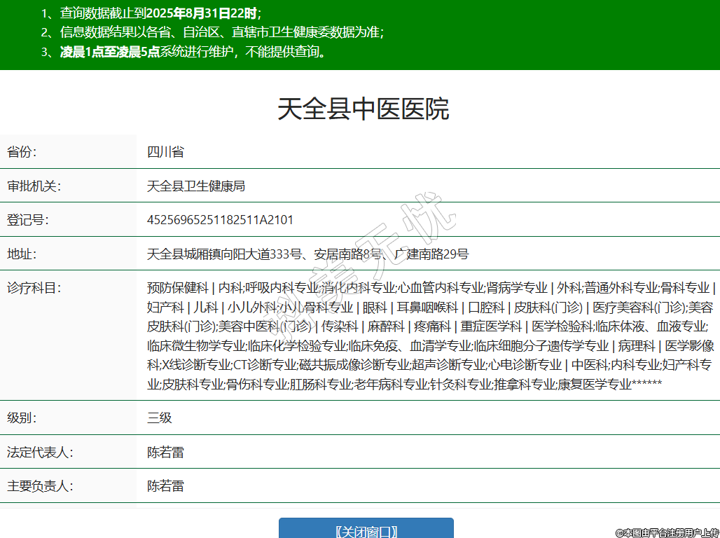 省份:四川省審批機(jī)關(guān):天全縣衛(wèi)生健康局登記號(hào):45256965251182511A2101地址:天全縣城廂鎮(zhèn)向陽(yáng)大道333號(hào)、安居南路8號(hào)、廣建南路29號(hào)診療科目:預(yù)防保健科 | 內(nèi)科;呼吸內(nèi)科專業(yè);消化內(nèi)科專業(yè);心血管內(nèi)科專業(yè);腎病學(xué)專業(yè) | 外科;普通外科專業(yè);骨科專業(yè) | 婦產(chǎn)科 | 兒科 | 小兒外科;小兒骨科專業(yè) | 眼科 | 耳鼻咽喉科 | 口腔科 | 皮膚科(門(mén)診) | 醫(yī)療美容科(門(mén)診);美容皮膚科(門(mén)診);美容中醫(yī)科(門(mén)診) | 傳染科 | 麻醉科 | 疼痛科 | 重癥醫(yī)學(xué)科 | 醫(yī)學(xué)檢驗(yàn)科;臨床體液、血液專業(yè);臨床微生物學(xué)專業(yè);臨床化學(xué)檢驗(yàn)專業(yè);臨床免疫、血清學(xué)專業(yè);臨床細(xì)胞分子遺傳學(xué)專業(yè) | 病理科 | 醫(yī)學(xué)影像科;X線診斷專業(yè);CT診斷專業(yè);磁共振成像診斷專業(yè);超聲診斷專業(yè);心電診斷專業(yè) | 中醫(yī)科;內(nèi)科專業(yè);婦產(chǎn)科專業(yè);皮膚科專業(yè);骨傷科專業(yè);肛腸科專業(yè);老年病科專業(yè);針灸科專業(yè);推拿科專業(yè);康復(fù)醫(yī)學(xué)專業(yè)******級(jí)別:三級(jí)法定代表人:陳若雷主要負(fù)責(zé)人:陳若雷執(zhí)業(yè)許可證有效期:2017/01/01 -至- 2031/12/31 -