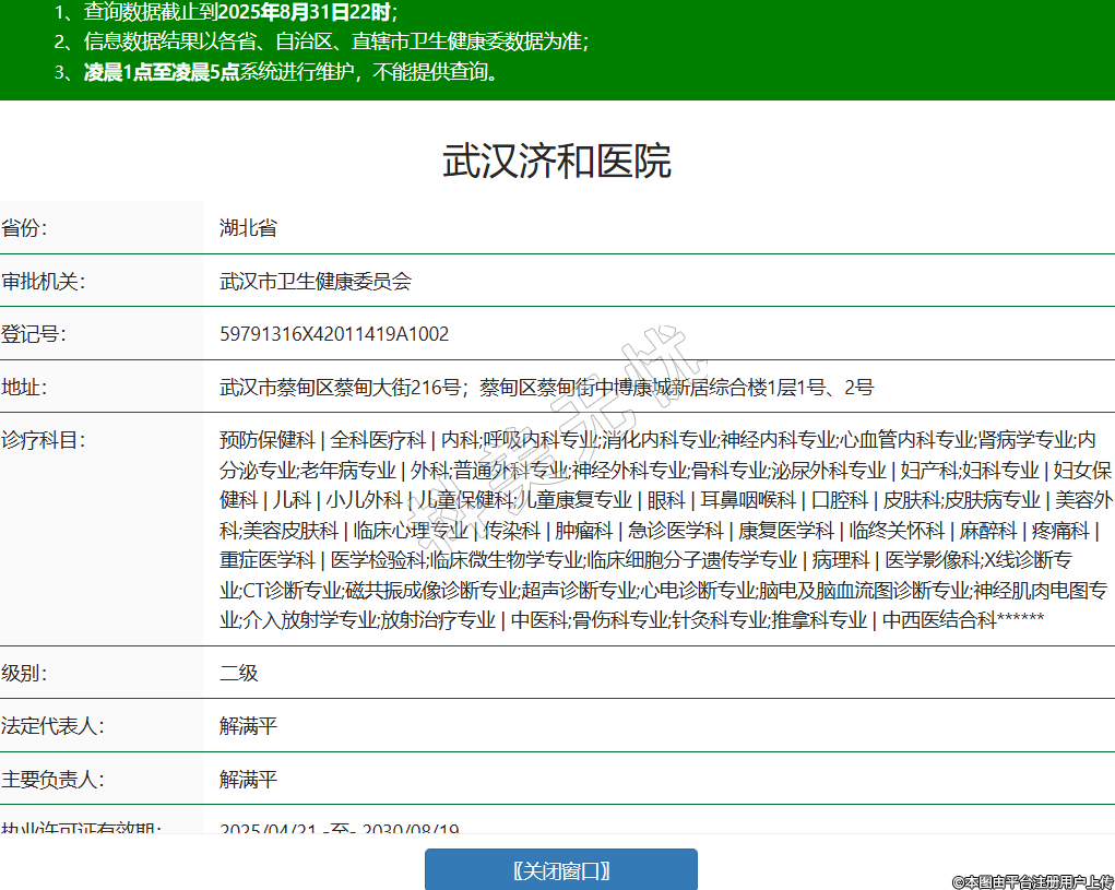 省份:湖北省審批機(jī)關(guān):武漢市衛(wèi)生健康委員會登記號:59791316X42011419A1002地址:武漢市蔡甸區(qū)蔡甸大街216號;蔡甸區(qū)蔡甸街中博康城新居綜合樓1層1號、2號診療科目:預(yù)防保健科 | 全科醫(yī)療科 | 內(nèi)科;呼吸內(nèi)科專業(yè);消化內(nèi)科專業(yè);神經(jīng)內(nèi)科專業(yè);心血管內(nèi)科專業(yè);腎病學(xué)專業(yè);內(nèi)分泌專業(yè);老年病專業(yè) | 外科;普通外科專業(yè);神經(jīng)外科專業(yè);骨科專業(yè);泌尿外科專業(yè) | 婦產(chǎn)科;婦科專業(yè) | 婦女保健科 | 兒科 | 小兒外科 | 兒童保健科;兒童康復(fù)專業(yè) | 眼科 | 耳鼻咽喉科 | 口腔科 | 皮膚科;皮膚病專業(yè) | 美容外科;美容皮膚科 | 臨床心理專業(yè) | 傳染科 | 腫瘤科 | 急診醫(yī)學(xué)科 | 康復(fù)醫(yī)學(xué)科 | 臨終關(guān)懷科 | 麻醉科 | 疼痛科 | 重癥醫(yī)學(xué)科 | 醫(yī)學(xué)檢驗科;臨床微生物學(xué)專業(yè);臨床細(xì)胞分子遺傳學(xué)專業(yè) | 病理科 | 醫(yī)學(xué)影像科;X線診斷專業(yè);CT診斷專業(yè);磁共振成像診斷專業(yè);超聲診斷專業(yè);心電診斷專業(yè);腦電及腦血流圖診斷專業(yè);神經(jīng)肌肉電圖專業(yè);介入放射學(xué)專業(yè);放射治療專業(yè) | 中醫(yī)科;骨傷科專業(yè);針灸科專業(yè);推拿科專業(yè) | 中西醫(yī)結(jié)合科******級別:二級法定代表人:解滿平主要負(fù)責(zé)人:解滿平執(zhí)業(yè)許可證有效期:2025/04/21 -至- 2030/08/19 -