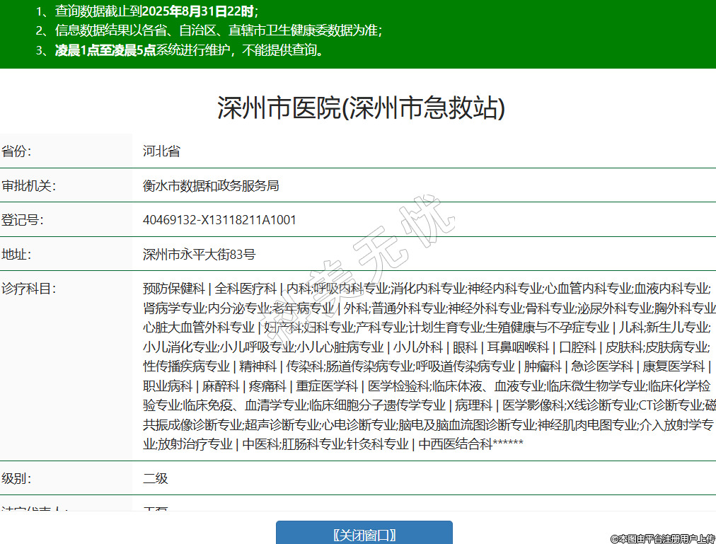 省份:河北省審批機(jī)關(guān):衡水市數(shù)據(jù)和政務(wù)服務(wù)局登記號(hào):40469132-X13118211A1001地址:深州市永平大街83號(hào)診療科目:預(yù)防保健科 | 全科醫(yī)療科 | 內(nèi)科;呼吸內(nèi)科專(zhuān)業(yè);消化內(nèi)科專(zhuān)業(yè);神經(jīng)內(nèi)科專(zhuān)業(yè);心血管內(nèi)科專(zhuān)業(yè);血液內(nèi)科專(zhuān)業(yè);腎病學(xué)專(zhuān)業(yè);內(nèi)分泌專(zhuān)業(yè);老年病專(zhuān)業(yè) | 外科;普通外科專(zhuān)業(yè);神經(jīng)外科專(zhuān)業(yè);骨科專(zhuān)業(yè);泌尿外科專(zhuān)業(yè);胸外科專(zhuān)業(yè);心臟大血管外科專(zhuān)業(yè) | 婦產(chǎn)科;婦科專(zhuān)業(yè);產(chǎn)科專(zhuān)業(yè);計(jì)劃生育專(zhuān)業(yè);生殖健康與不孕癥專(zhuān)業(yè) | 兒科;新生兒專(zhuān)業(yè);小兒消化專(zhuān)業(yè);小兒呼吸專(zhuān)業(yè);小兒心臟病專(zhuān)業(yè) | 小兒外科 | 眼科 | 耳鼻咽喉科 | 口腔科 | 皮膚科;皮膚病專(zhuān)業(yè);性傳播疾病專(zhuān)業(yè) | 精神科 | 傳染科;腸道傳染病專(zhuān)業(yè);呼吸道傳染病專(zhuān)業(yè) | 腫瘤科 | 急診醫(yī)學(xué)科 | 康復(fù)醫(yī)學(xué)科 | 職業(yè)病科 | 麻醉科 | 疼痛科 | 重癥醫(yī)學(xué)科 | 醫(yī)學(xué)檢驗(yàn)科;臨床體液、血液專(zhuān)業(yè);臨床微生物學(xué)專(zhuān)業(yè);臨床化學(xué)檢驗(yàn)專(zhuān)業(yè);臨床免疫、血清學(xué)專(zhuān)業(yè);臨床細(xì)胞分子遺傳學(xué)專(zhuān)業(yè) | 病理科 | 醫(yī)學(xué)影像科;X線診斷專(zhuān)業(yè);CT診斷專(zhuān)業(yè);磁共振成像診斷專(zhuān)業(yè);超聲診斷專(zhuān)業(yè);心電診斷專(zhuān)業(yè);腦電及腦血流圖診斷專(zhuān)業(yè);神經(jīng)肌肉電圖專(zhuān)業(yè);介入放射學(xué)專(zhuān)業(yè);放射治療專(zhuān)業(yè) | 中醫(yī)科;肛腸科專(zhuān)業(yè);針灸科專(zhuān)業(yè) | 中西醫(yī)結(jié)合科******級(jí)別:二級(jí)法定代表人:王磊主要負(fù)責(zé)人:寇興執(zhí)業(yè)許可證有效期:2017/12/02 -至- 2032/12/01 -