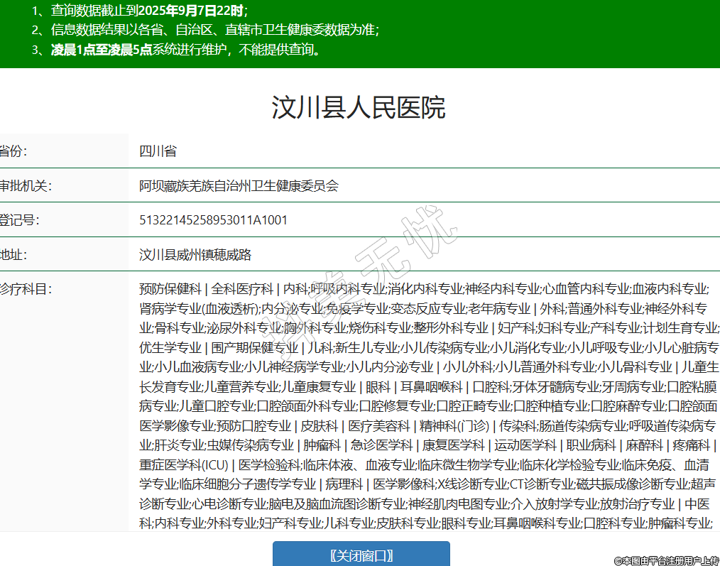 省份:四川省審批機關:阿壩藏族羌族自治州衛(wèi)生健康委員會登記號:51322145258953011A1001地址:汶川縣威州鎮(zhèn)穂威路診療科目:預防保健科 | 全科醫(yī)療科 | 內(nèi)科;呼吸內(nèi)科專業(yè);消化內(nèi)科專業(yè);神經(jīng)內(nèi)科專業(yè);心血管內(nèi)科專業(yè);血液內(nèi)科專業(yè);腎病學專業(yè)(血液透析);內(nèi)分泌專業(yè);免疫學專業(yè);變態(tài)反應專業(yè);老年病專業(yè) | 外科;普通外科專業(yè);神經(jīng)外科專業(yè);骨科專業(yè);泌尿外科專業(yè);胸外科專業(yè);燒傷科專業(yè);整形外科專業(yè) | 婦產(chǎn)科;婦科專業(yè);產(chǎn)科專業(yè);計劃生育專業(yè);優(yōu)生學專業(yè) | 圍產(chǎn)期保健專業(yè) | 兒科;新生兒專業(yè);小兒傳染病專業(yè);小兒消化專業(yè);小兒呼吸專業(yè);小兒心臟病專業(yè);小兒血液病專業(yè);小兒神經(jīng)病學專業(yè);小兒內(nèi)分泌專業(yè) | 小兒外科;小兒普通外科專業(yè);小兒骨科專業(yè) | 兒童生長發(fā)育專業(yè);兒童營養(yǎng)專業(yè);兒童康復專業(yè) | 眼科 | 耳鼻咽喉科 | 口腔科;牙體牙髓病專業(yè);牙周病專業(yè);口腔粘膜病專業(yè);兒童口腔專業(yè);口腔頜面外科專業(yè);口腔修復專業(yè);口腔正畸專業(yè);口腔種植專業(yè);口腔麻醉專業(yè);口腔頜面醫(yī)學影像專業(yè);預防口腔專業(yè) | 皮膚科 | 醫(yī)療美容科 | 精神科(門診) | 傳染科;腸道傳染病專業(yè);呼吸道傳染病專業(yè);肝炎專業(yè);蟲媒傳染病專業(yè) | 腫瘤科 | 急診醫(yī)學科 | 康復醫(yī)學科 | 運動醫(yī)學科 | 職業(yè)病科 | 麻醉科 | 疼痛科 | 重癥醫(yī)學科(ICU) | 醫(yī)學檢驗科;臨床體液、血液專業(yè);臨床微生物學專業(yè);臨床化學檢驗專業(yè);臨床免疫、血清學專業(yè);臨床細胞分子遺傳學專業(yè) | 病理科 | 醫(yī)學影像科;X線診斷專業(yè);CT診斷專業(yè);磁共振成像診斷專業(yè);超聲診斷專業(yè);心電診斷專業(yè);腦電及腦血流圖診斷專業(yè);神經(jīng)肌肉電圖專業(yè);介入放射學專業(yè);放射治療專業(yè) | 中醫(yī)科;內(nèi)科專業(yè);外科專業(yè);婦產(chǎn)科專業(yè);兒科專業(yè);皮膚科專業(yè);眼科專業(yè);耳鼻咽喉科專業(yè);口腔科專業(yè);腫瘤科專業(yè);骨傷科專業(yè);肛腸科專業(yè);老年病科專業(yè);針灸科專業(yè);推拿科專業(yè);康復醫(yī)學專業(yè);預防保健科專業(yè) | 民族醫(yī)學科 | 中西醫(yī)結合科******級別:三級法定代表人:馮盧主要負責人:馮盧執(zhí)業(yè)許可證有效期:2023/04/25 -至- 2038/04/25 -