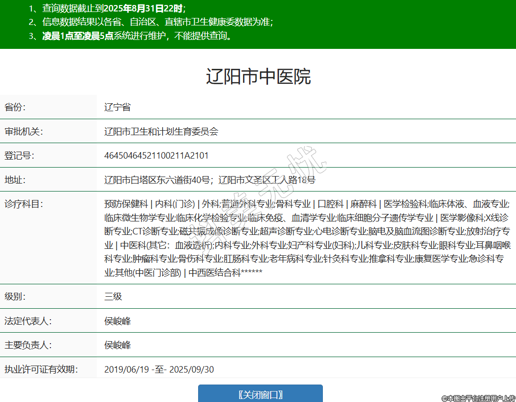 省份:遼寧省審批機(jī)關(guān):遼陽(yáng)市衛(wèi)生和計(jì)劃生育委員會(huì)登記號(hào):46450464521100211A2101地址:遼陽(yáng)市白塔區(qū)東六道街40號(hào);遼陽(yáng)市文圣區(qū)工人路18號(hào)診療科目:預(yù)防保健科 | 內(nèi)科(門診) | 外科;普通外科專業(yè);骨科專業(yè) | 口腔科 | 麻醉科 | 醫(yī)學(xué)檢驗(yàn)科;臨床體液、血液專業(yè);臨床微生物學(xué)專業(yè);臨床化學(xué)檢驗(yàn)專業(yè);臨床免疫、血清學(xué)專業(yè);臨床細(xì)胞分子遺傳學(xué)專業(yè) | 醫(yī)學(xué)影像科;X線診斷專業(yè);CT診斷專業(yè);磁共振成像診斷專業(yè);超聲診斷專業(yè);心電診斷專業(yè);腦電及腦血流圖診斷專業(yè);放射治療專業(yè) | 中醫(yī)科(其它:血液透析);內(nèi)科專業(yè);外科專業(yè);婦產(chǎn)科專業(yè)(婦科);兒科專業(yè);皮膚科專業(yè);眼科專業(yè);耳鼻咽喉科專業(yè);腫瘤科專業(yè);骨傷科專業(yè);肛腸科專業(yè);老年病科專業(yè);針灸科專業(yè);推拿科專業(yè);康復(fù)醫(yī)學(xué)專業(yè);急診科專業(yè);其他(中醫(yī)門診部) | 中西醫(yī)結(jié)合科******級(jí)別:三級(jí)法定代表人:侯峻峰主要負(fù)責(zé)人:侯峻峰2019/06/19 -至- 2025/09/30 -