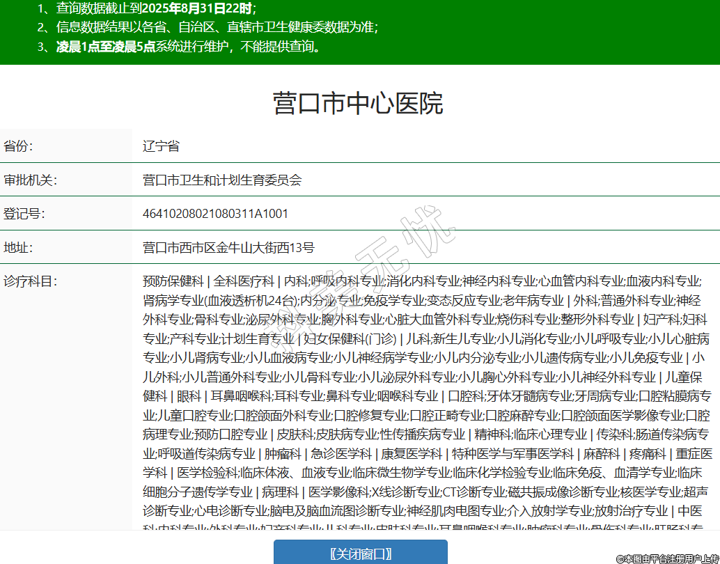 省份:遼寧省審批機(jī)關(guān):營口市衛(wèi)生和計(jì)劃生育委員會(huì)登記號(hào):46410208021080311A1001地址:營口市西市區(qū)金牛山大街西13號(hào)診療科目:預(yù)防保健科 | 全科醫(yī)療科 | 內(nèi)科;呼吸內(nèi)科專業(yè);消化內(nèi)科專業(yè);神經(jīng)內(nèi)科專業(yè);心血管內(nèi)科專業(yè);血液內(nèi)科專業(yè);腎病學(xué)專業(yè)(血液透析機(jī)24臺(tái));內(nèi)分泌專業(yè);免疫學(xué)專業(yè);變態(tài)反應(yīng)專業(yè);老年病專業(yè) | 外科;普通外科專業(yè);神經(jīng)外科專業(yè);骨科專業(yè);泌尿外科專業(yè);胸外科專業(yè);心臟大血管外科專業(yè);燒傷科專業(yè);整形外科專業(yè) | 婦產(chǎn)科;婦科專業(yè);產(chǎn)科專業(yè);計(jì)劃生育專業(yè) | 婦女保健科(門診) | 兒科;新生兒專業(yè);小兒消化專業(yè);小兒呼吸專業(yè);小兒心臟病專業(yè);小兒腎病專業(yè);小兒血液病專業(yè);小兒神經(jīng)病學(xué)專業(yè);小兒內(nèi)分泌專業(yè);小兒遺傳病專業(yè);小兒免疫專業(yè) | 小兒外科;小兒普通外科專業(yè);小兒骨科專業(yè);小兒泌尿外科專業(yè);小兒胸心外科專業(yè);小兒神經(jīng)外科專業(yè) | 兒童保健科 | 眼科 | 耳鼻咽喉科;耳科專業(yè);鼻科專業(yè);咽喉科專業(yè) | 口腔科;牙體牙髓病專業(yè);牙周病專業(yè);口腔粘膜病專業(yè);兒童口腔專業(yè);口腔頜面外科專業(yè);口腔修復(fù)專業(yè);口腔正畸專業(yè);口腔麻醉專業(yè);口腔頜面醫(yī)學(xué)影像專業(yè);口腔病理專業(yè);預(yù)防口腔專業(yè) | 皮膚科;皮膚病專業(yè);性傳播疾病專業(yè) | 精神科;臨床心理專業(yè) | 傳染科;腸道傳染病專業(yè);呼吸道傳染病專業(yè) | 腫瘤科 | 急診醫(yī)學(xué)科 | 康復(fù)醫(yī)學(xué)科 | 特種醫(yī)學(xué)與軍事醫(yī)學(xué)科 | 麻醉科 | 疼痛科 | 重癥醫(yī)學(xué)科 | 醫(yī)學(xué)檢驗(yàn)科;臨床體液、血液專業(yè);臨床微生物學(xué)專業(yè);臨床化學(xué)檢驗(yàn)專業(yè);臨床免疫、血清學(xué)專業(yè);臨床細(xì)胞分子遺傳學(xué)專業(yè) | 病理科 | 醫(yī)學(xué)影像科;X線診斷專業(yè);CT診斷專業(yè);磁共振成像診斷專業(yè);核醫(yī)學(xué)專業(yè);超聲診斷專業(yè);心電診斷專業(yè);腦電及腦血流圖診斷專業(yè);神經(jīng)肌肉電圖專業(yè);介入放射學(xué)專業(yè);放射治療專業(yè) | 中醫(yī)科;內(nèi)科專業(yè);外科專業(yè);婦產(chǎn)科專業(yè);兒科專業(yè);皮膚科專業(yè);耳鼻咽喉科專業(yè);腫瘤科專業(yè);骨傷科專業(yè);肛腸科專業(yè);老年病科專業(yè);針灸科專業(yè);推拿科專業(yè);康復(fù)醫(yī)學(xué)專業(yè) | 中西醫(yī)結(jié)合科(門診)******級(jí)別:三級(jí)法定代表人:劉學(xué)英主要負(fù)責(zé)人:劉學(xué)英執(zhí)業(yè)許可證有效期:2019/11/15 -至- 2034/11/14 -