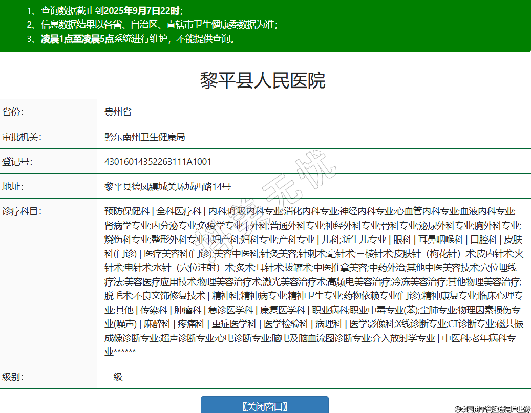 省份:貴州省審批機(jī)關(guān):黔東南州衛(wèi)生健康局登記號(hào):43016014352263111A1001地址:黎平縣德鳳鎮(zhèn)城關(guān)環(huán)城西路14號(hào)診療科目:預(yù)防保健科 | 全科醫(yī)療科 | 內(nèi)科;呼吸內(nèi)科專業(yè);消化內(nèi)科專業(yè);神經(jīng)內(nèi)科專業(yè);心血管內(nèi)科專業(yè);血液內(nèi)科專業(yè);腎病學(xué)專業(yè);內(nèi)分泌專業(yè);免疫學(xué)專業(yè) | 外科;普通外科專業(yè);神經(jīng)外科專業(yè);骨科專業(yè);泌尿外科專業(yè);胸外科專業(yè);燒傷科專業(yè);整形外科專業(yè) | 婦產(chǎn)科;婦科專業(yè);產(chǎn)科專業(yè) | 兒科;新生兒專業(yè) | 眼科 | 耳鼻咽喉科 | 口腔科 | 皮膚科(門診) | 醫(yī)療美容科(門診);美容中醫(yī)科;針灸美容;針刺術(shù);毫針術(shù);三棱針術(shù);皮膚針(梅花針)術(shù);皮內(nèi)針術(shù);火針術(shù);電針術(shù);水針(穴位注射)術(shù);炙術(shù);耳針術(shù);拔罐術(shù);中醫(yī)推拿美容;中藥外治;其他中醫(yī)美容技術(shù);穴位埋線療法;美容醫(yī)療應(yīng)用技術(shù);物理美容治療術(shù);激光美容治療術(shù);高頻電美容治療;冷凍美容治療;其他物理美容治療;脫毛術(shù);不良文飾修復(fù)技術(shù) | 精神科;精神病專業(yè);精神衛(wèi)生專業(yè);藥物依賴專業(yè)(門診);精神康復(fù)專業(yè);臨床心理專業(yè);其他 | 傳染科 | 腫瘤科 | 急診醫(yī)學(xué)科 | 康復(fù)醫(yī)學(xué)科 | 職業(yè)病科;職業(yè)中毒專業(yè)(苯);塵肺專業(yè);物理因素?fù)p傷專業(yè)(噪聲) | 麻醉科 | 疼痛科 | 重癥醫(yī)學(xué)科 | 醫(yī)學(xué)檢驗(yàn)科 | 病理科 | 醫(yī)學(xué)影像科;X線診斷專業(yè);CT診斷專業(yè);磁共振成像診斷專業(yè);超聲診斷專業(yè);心電診斷專業(yè);腦電及腦血流圖診斷專業(yè);介入放射學(xué)專業(yè) | 中醫(yī)科;老年病科專業(yè)******級(jí)別:二級(jí)法定代表人:李勇主要負(fù)責(zé)人:李勇執(zhí)業(yè)許可證有效期:2025/05/12 -至- 2040/05/11 -