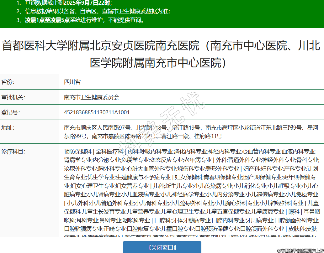 省份:四川省審批機關(guān):南充市衛(wèi)生健康委員會登記號:45218368851130211A1001地址:南充市順慶區(qū)人民南路97號、北湖路118號、涪江路19號,南充市高坪區(qū)小龍街道江東北路三段9號、星河?xùn)|路99號,南充市嘉陵區(qū)陳壽路112號、春江路一段、桂府路33號診療科目:預(yù)防保健科 | 全科醫(yī)療科 | 內(nèi)科;呼吸內(nèi)科專業(yè);消化內(nèi)科專業(yè);神經(jīng)內(nèi)科專業(yè);心血管內(nèi)科專業(yè);血液內(nèi)科專業(yè);腎病學(xué)專業(yè);內(nèi)分泌專業(yè);免疫學(xué)專業(yè);變態(tài)反應(yīng)專業(yè);老年病專業(yè) | 外科;普通外科專業(yè);神經(jīng)外科專業(yè);骨科專業(yè);泌尿外科專業(yè);胸外科專業(yè);心臟大血管外科專業(yè);燒傷科專業(yè);整形外科專業(yè) | 婦產(chǎn)科;婦科專業(yè);產(chǎn)科專業(yè);計劃生育專業(yè);優(yōu)生學(xué)專業(yè);生殖健康與不孕癥專業(yè) | 婦女保健科;青春期保健專業(yè);圍產(chǎn)期保健專業(yè);更年期保健專業(yè);婦女心理衛(wèi)生專業(yè);婦女營養(yǎng)專業(yè) | 兒科;新生兒專業(yè);小兒傳染病專業(yè);小兒消化專業(yè);小兒呼吸專業(yè);小兒心臟病專業(yè);小兒腎病專業(yè);小兒血液病專業(yè);小兒神經(jīng)病學(xué)專業(yè);小兒內(nèi)分泌專業(yè);小兒遺傳病專業(yè);小兒免疫專業(yè) | 小兒外科;小兒普通外科專業(yè);小兒骨科專業(yè);小兒泌尿外科專業(yè);小兒胸心外科專業(yè);小兒神經(jīng)外科專業(yè) | 兒童保健科;兒童生長發(fā)育專業(yè);兒童營養(yǎng)專業(yè);兒童心理衛(wèi)生專業(yè);兒童五官保健專業(yè);兒童康復(fù)專業(yè) | 眼科 | 耳鼻咽喉科;耳科專業(yè);鼻科專業(yè);咽喉科專業(yè) | 口腔科;牙體牙髓病專業(yè);口腔內(nèi)科專業(yè);牙周病專業(yè);口腔頜面外科專業(yè);口腔粘膜病專業(yè);正畸專業(yè);口腔修復(fù)專業(yè);兒童口腔專業(yè);口腔預(yù)防保健專業(yè);口腔頜面外科專業(yè) | 皮膚科;皮膚病專業(yè);性傳播疾病專業(yè) | 醫(yī)療美容科;美容外科;美容牙科;美容皮膚科 | 精神科;精神衛(wèi)生專業(yè);精神康復(fù)專業(yè);臨床心理專業(yè) | 傳染科;腸道傳染病專業(yè);呼吸道傳染病專業(yè);肝炎專業(yè);蟲媒傳染病專業(yè);動物源性傳染病專業(yè);蠕蟲病專業(yè) | 結(jié)核病科 | 腫瘤科 | 急診醫(yī)學(xué)科 | 康復(fù)醫(yī)學(xué)科 | 職業(yè)病科(門診);職業(yè)中毒專業(yè)(門診);塵肺專業(yè)(門診);放射病專業(yè)(門診);物理因素?fù)p傷專業(yè)(門診);職業(yè)健康監(jiān)護(hù)專業(yè)(門診) | 麻醉科 | 疼痛科 | 重癥醫(yī)學(xué)科 | 醫(yī)學(xué)檢驗科;臨床體液、血液專業(yè);臨床微生物學(xué)專業(yè);臨床化學(xué)檢驗專業(yè);臨床免疫、血清學(xué)專業(yè);臨床細(xì)胞分子遺傳學(xué)專業(yè) | 病理科 | 醫(yī)學(xué)影像科;X線診斷專業(yè);CT診斷專業(yè);磁共振成像診斷專業(yè);核醫(yī)學(xué)專業(yè);超聲診斷專業(yè);心電診斷專業(yè);腦電及腦血流圖診斷專業(yè);神經(jīng)肌肉電圖專業(yè);介入放射學(xué)專業(yè);放射治療專業(yè) | 中醫(yī)科;內(nèi)科專業(yè);外科專業(yè);婦產(chǎn)科專業(yè);兒科專業(yè);眼科專業(yè);耳鼻咽喉科專業(yè);腫瘤科專業(yè);骨傷科專業(yè);肛腸科專業(yè);老年病科專業(yè);針灸科專業(yè);推拿科專業(yè);康復(fù)醫(yī)學(xué)專業(yè);急診科專業(yè) | 中西醫(yī)結(jié)合科******級別:三級法定代表人:劉楊主要負(fù)責(zé)人:劉楊執(zhí)業(yè)許可證有效期:2025/07/03 -至- 2036/09/14 -