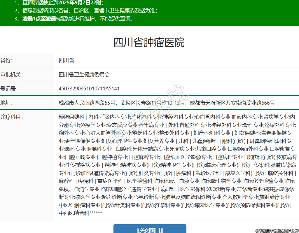 省份:四川省審批機(jī)關(guān):四川省衛(wèi)生健康委員會(huì)登記號(hào):45073290351010711A5141地址:成都市人民南路四段55號(hào),武侯區(qū)長壽路11號(hào)附10-13號(hào),成都市天府新區(qū)萬安街道茂業(yè)路666號(hào)診療科目:預(yù)防保健科 | 內(nèi)科;呼吸內(nèi)科專業(yè);消化內(nèi)科專業(yè);神經(jīng)內(nèi)科專業(yè);心血管內(nèi)科專業(yè);血液內(nèi)科專業(yè);腎病學(xué)專業(yè);內(nèi)分泌專業(yè);免疫學(xué)專業(yè);變態(tài)反應(yīng)專業(yè);老年病專業(yè) | 外科;普通外科專業(yè);神經(jīng)外科專業(yè);骨科專業(yè);泌尿外科專業(yè);胸外科專業(yè);心臟大血管外科專業(yè);燒傷科專業(yè);整形外科專業(yè) | 婦產(chǎn)科;婦科專業(yè) | 婦女保健科;青春期保健專業(yè);更年期保健專業(yè);婦女心理衛(wèi)生專業(yè);婦女營養(yǎng)專業(yè) | 兒科 | 兒童保健科 | 眼科(門診) | 耳鼻咽喉科;耳科專業(yè);鼻科專業(yè);咽喉科專業(yè) | 口腔科;牙體牙髓病專業(yè);牙周病專業(yè);兒童口腔專業(yè);口腔頜面外科專業(yè);口腔修復(fù)專業(yè);口腔正畸專業(yè);口腔種植專業(yè);口腔麻醉專業(yè);口腔頜面醫(yī)學(xué)影像專業(yè);口腔病理專業(yè) | 皮膚科(門診);皮膚病專業(yè);性傳播疾病專業(yè) | 精神科;精神病專業(yè)(門診);精神衛(wèi)生專業(yè)(門診);臨床心理專業(yè)(門診) | 傳染科;腸道傳染病專業(yè)(門診);呼吸道傳染病專業(yè)(門診);肝炎專業(yè)(門診) | 腫瘤科 | 急診醫(yī)學(xué)科 | 康復(fù)醫(yī)學(xué)科(門診) | 臨終關(guān)懷科 | 麻醉科 | 疼痛科 | 重癥醫(yī)學(xué)科 | 醫(yī)學(xué)檢驗(yàn)科;臨床體液、血液專業(yè);臨床微生物學(xué)專業(yè);臨床化學(xué)檢驗(yàn)專業(yè);臨床免疫、血清學(xué)專業(yè);臨床細(xì)胞分子遺傳學(xué)專業(yè) | 病理科 | 醫(yī)學(xué)影像科;X線診斷專業(yè);CT診斷專業(yè);磁共振成像診斷專業(yè);核醫(yī)學(xué)專業(yè);超聲診斷專業(yè);心電診斷專業(yè);腦電及腦血流圖診斷專業(yè);介入放射學(xué)專業(yè);放射治療專業(yè) | 中醫(yī)科;腫瘤科專業(yè)(門診);針灸科專業(yè)(門診);推拿科專業(yè)(門診);康復(fù)醫(yī)學(xué)專業(yè)(門診);預(yù)防保健科專業(yè)(門診) | 中西醫(yī)結(jié)合科******級(jí)別:三級(jí)法定代表人:林桐榆主要負(fù)責(zé)人:林桐榆執(zhí)業(yè)許可證有效期:2022/01/01 -至- 2036/12/31 -