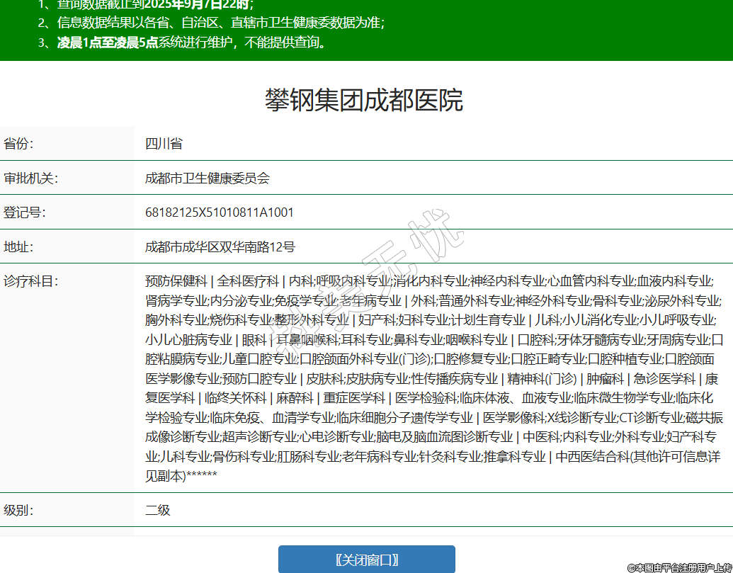 省份:四川省審批機(jī)關(guān):成都市衛(wèi)生健康委員會(huì)登記號(hào):68182125X51010811A1001地址:成都市成華區(qū)雙華南路12號(hào)診療科目:預(yù)防保健科 | 全科醫(yī)療科 | 內(nèi)科;呼吸內(nèi)科專(zhuān)業(yè);消化內(nèi)科專(zhuān)業(yè);神經(jīng)內(nèi)科專(zhuān)業(yè);心血管內(nèi)科專(zhuān)業(yè);血液內(nèi)科專(zhuān)業(yè);腎病學(xué)專(zhuān)業(yè);內(nèi)分泌專(zhuān)業(yè);免疫學(xué)專(zhuān)業(yè);老年病專(zhuān)業(yè) | 外科;普通外科專(zhuān)業(yè);神經(jīng)外科專(zhuān)業(yè);骨科專(zhuān)業(yè);泌尿外科專(zhuān)業(yè);胸外科專(zhuān)業(yè);燒傷科專(zhuān)業(yè);整形外科專(zhuān)業(yè) | 婦產(chǎn)科;婦科專(zhuān)業(yè);計(jì)劃生育專(zhuān)業(yè) | 兒科;小兒消化專(zhuān)業(yè);小兒呼吸專(zhuān)業(yè);小兒心臟病專(zhuān)業(yè) | 眼科 | 耳鼻咽喉科;耳科專(zhuān)業(yè);鼻科專(zhuān)業(yè);咽喉科專(zhuān)業(yè) | 口腔科;牙體牙髓病專(zhuān)業(yè);牙周病專(zhuān)業(yè);口腔粘膜病專(zhuān)業(yè);兒童口腔專(zhuān)業(yè);口腔頜面外科專(zhuān)業(yè)(門(mén)診);口腔修復(fù)專(zhuān)業(yè);口腔正畸專(zhuān)業(yè);口腔種植專(zhuān)業(yè);口腔頜面醫(yī)學(xué)影像專(zhuān)業(yè);預(yù)防口腔專(zhuān)業(yè) | 皮膚科;皮膚病專(zhuān)業(yè);性傳播疾病專(zhuān)業(yè) | 精神科(門(mén)診) | 腫瘤科 | 急診醫(yī)學(xué)科 | 康復(fù)醫(yī)學(xué)科 | 臨終關(guān)懷科 | 麻醉科 | 重癥醫(yī)學(xué)科 | 醫(yī)學(xué)檢驗(yàn)科;臨床體液、血液專(zhuān)業(yè);臨床微生物學(xué)專(zhuān)業(yè);臨床化學(xué)檢驗(yàn)專(zhuān)業(yè);臨床免疫、血清學(xué)專(zhuān)業(yè);臨床細(xì)胞分子遺傳學(xué)專(zhuān)業(yè) | 醫(yī)學(xué)影像科;X線(xiàn)診斷專(zhuān)業(yè);CT診斷專(zhuān)業(yè);磁共振成像診斷專(zhuān)業(yè);超聲診斷專(zhuān)業(yè);心電診斷專(zhuān)業(yè);腦電及腦血流圖診斷專(zhuān)業(yè) | 中醫(yī)科;內(nèi)科專(zhuān)業(yè);外科專(zhuān)業(yè);婦產(chǎn)科專(zhuān)業(yè);兒科專(zhuān)業(yè);骨傷科專(zhuān)業(yè);肛腸科專(zhuān)業(yè);老年病科專(zhuān)業(yè);針灸科專(zhuān)業(yè);推拿科專(zhuān)業(yè) | 中西醫(yī)結(jié)合科(其他許可信息詳見(jiàn)副本)******級(jí)別:二級(jí)法定代表人:余生源主要負(fù)責(zé)人:余生源執(zhí)業(yè)許可證有效期:2021/07/06 -至- 2028/01/11 -