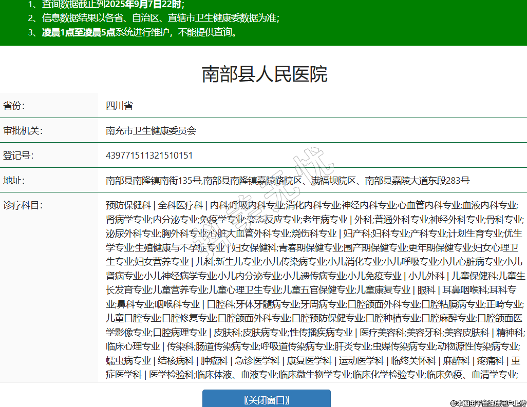 省份:四川省審批機(jī)關(guān):南充市衛(wèi)生健康委員會登記號:439771511321510151地址:南部縣南隆鎮(zhèn)南街135號,南部縣南隆鎮(zhèn)嘉陵路院區(qū)、滿福壩院區(qū)、南部縣嘉陵大道東段283號診療科目:預(yù)防保健科 | 全科醫(yī)療科 | 內(nèi)科;呼吸內(nèi)科專業(yè);消化內(nèi)科專業(yè);神經(jīng)內(nèi)科專業(yè);心血管內(nèi)科專業(yè);血液內(nèi)科專業(yè);腎病學(xué)專業(yè);內(nèi)分泌專業(yè);免疫學(xué)專業(yè);變態(tài)反應(yīng)專業(yè);老年病專業(yè) | 外科;普通外科專業(yè);神經(jīng)外科專業(yè);骨科專業(yè);泌尿外科專業(yè);胸外科專業(yè);心臟大血管外科專業(yè);燒傷科專業(yè) | 婦產(chǎn)科;婦科專業(yè);產(chǎn)科專業(yè);計劃生育專業(yè);優(yōu)生學(xué)專業(yè);生殖健康與不孕癥專業(yè) | 婦女保健科;青春期保健專業(yè);圍產(chǎn)期保健專業(yè);更年期保健專業(yè);婦女心理衛(wèi)生專業(yè);婦女營養(yǎng)專業(yè) | 兒科;新生兒專業(yè);小兒傳染病專業(yè);小兒消化專業(yè);小兒呼吸專業(yè);小兒心臟病專業(yè);小兒腎病專業(yè);小兒神經(jīng)病學(xué)專業(yè);小兒內(nèi)分泌專業(yè);小兒遺傳病專業(yè);小兒免疫專業(yè) | 小兒外科 | 兒童保健科;兒童生長發(fā)育專業(yè);兒童營養(yǎng)專業(yè);兒童心理衛(wèi)生專業(yè);兒童五官保健專業(yè);兒童康復(fù)專業(yè) | 眼科 | 耳鼻咽喉科;耳科專業(yè);鼻科專業(yè);咽喉科專業(yè) | 口腔科;牙體牙髓病專業(yè);牙周病專業(yè);口腔頜面外科專業(yè);口腔粘膜病專業(yè);正畸專業(yè);兒童口腔專業(yè);口腔修復(fù)專業(yè);口腔頜面外科專業(yè);口腔預(yù)防保健專業(yè);口腔種植專業(yè);口腔麻醉專業(yè);口腔頜面醫(yī)學(xué)影像專業(yè);口腔病理專業(yè) | 皮膚科;皮膚病專業(yè);性傳播疾病專業(yè) | 醫(yī)療美容科;美容牙科;美容皮膚科 | 精神科;臨床心理專業(yè) | 傳染科;腸道傳染病專業(yè);呼吸道傳染病專業(yè);肝炎專業(yè);蟲媒傳染病專業(yè);動物源性傳染病專業(yè);蠕蟲病專業(yè) | 結(jié)核病科 | 腫瘤科 | 急診醫(yī)學(xué)科 | 康復(fù)醫(yī)學(xué)科 | 運動醫(yī)學(xué)科 | 臨終關(guān)懷科 | 麻醉科 | 疼痛科 | 重癥醫(yī)學(xué)科 | 醫(yī)學(xué)檢驗科;臨床體液、血液專業(yè);臨床微生物學(xué)專業(yè);臨床化學(xué)檢驗專業(yè);臨床免疫、血清學(xué)專業(yè);臨床細(xì)胞分子遺傳學(xué)專業(yè) | 病理科 | 醫(yī)學(xué)影像科;X線診斷專業(yè);CT診斷專業(yè);磁共振成像診斷專業(yè);超聲診斷專業(yè);心電診斷專業(yè);腦電及腦血流圖診斷專業(yè);神經(jīng)肌肉電圖專業(yè);介入放射學(xué)專業(yè);放射治療專業(yè) | 中醫(yī)科;內(nèi)科專業(yè);骨傷科專業(yè);肛腸科專業(yè);針灸科專業(yè);推拿科專業(yè);康復(fù)醫(yī)學(xué)專業(yè) | 中西醫(yī)結(jié)合科******級別:三級法定代表人:向仲達(dá)主要負(fù)責(zé)人:向仲達(dá)執(zhí)業(yè)許可證有效期:2025/12/01 -至- 2040/11/30 -