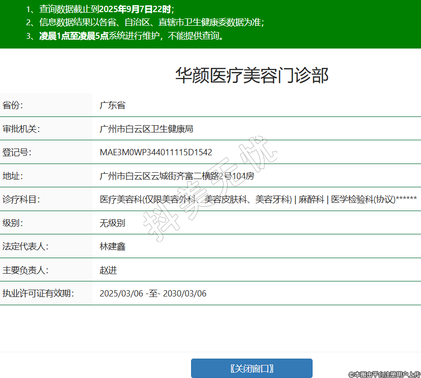 省份:廣東省審批機(jī)關(guān):廣州市白云區(qū)衛(wèi)生健康局登記號(hào):MAE3M0WP344011115D1542地址:廣州市白云區(qū)云城街齊富二橫路2號(hào)104房診療科目:醫(yī)療美容科(僅限美容外科、美容皮膚科、美容牙科) | 麻醉科 | 醫(yī)學(xué)檢驗(yàn)科(協(xié)議)******級(jí)別:無級(jí)別法定代表人:林建鑫主要負(fù)責(zé)人:趙進(jìn)執(zhí)業(yè)許可證有效期:2025/03/06 -至- 2030/03/06 -