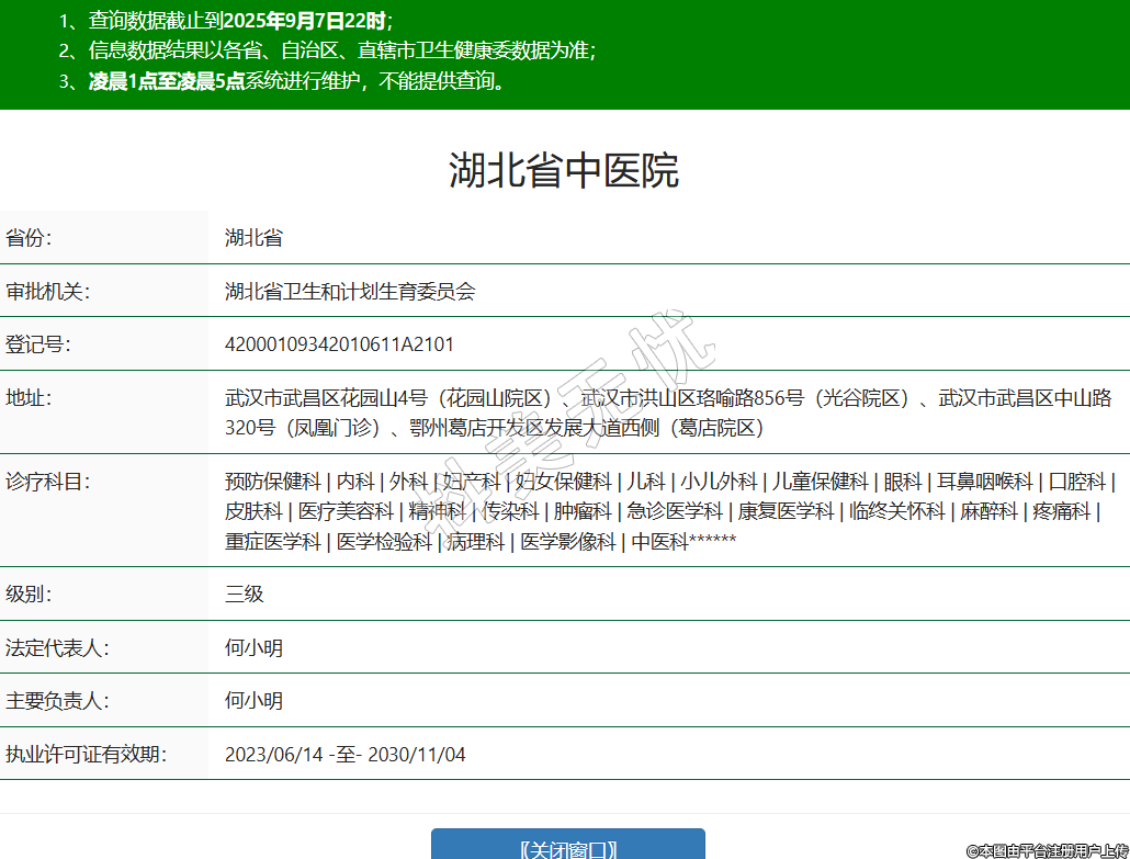 省份:湖北省審批機關(guān):湖北省衛(wèi)生和計劃生育委員會登記號:42000109342010611A2101地址:武漢市武昌區(qū)花園山4號(花園山院區(qū))、武漢市洪山區(qū)珞喻路856號(光谷院區(qū))、武漢市武昌區(qū)中山路320號(鳳凰門診)、鄂州葛店開發(fā)區(qū)發(fā)展大道西側(cè)(葛店院區(qū))診療科目:預防保健科 | 內(nèi)科 | 外科 | 婦產(chǎn)科 | 婦女保健科 | 兒科 | 小兒外科 | 兒童保健科 | 眼科 | 耳鼻咽喉科 | 口腔科 | 皮膚科 | 醫(yī)療美容科 | 精神科 | 傳染科 | 腫瘤科 | 急診醫(yī)學科 | 康復醫(yī)學科 | 臨終關(guān)懷科 | 麻醉科 | 疼痛科 | 重癥醫(yī)學科 | 醫(yī)學檢驗科 | 病理科 | 醫(yī)學影像科 | 中醫(yī)科******級別:三級法定代表人:何小明主要負責人:何小明執(zhí)業(yè)許可證有效期:2023/06/14 -至- 2030/11/04 -