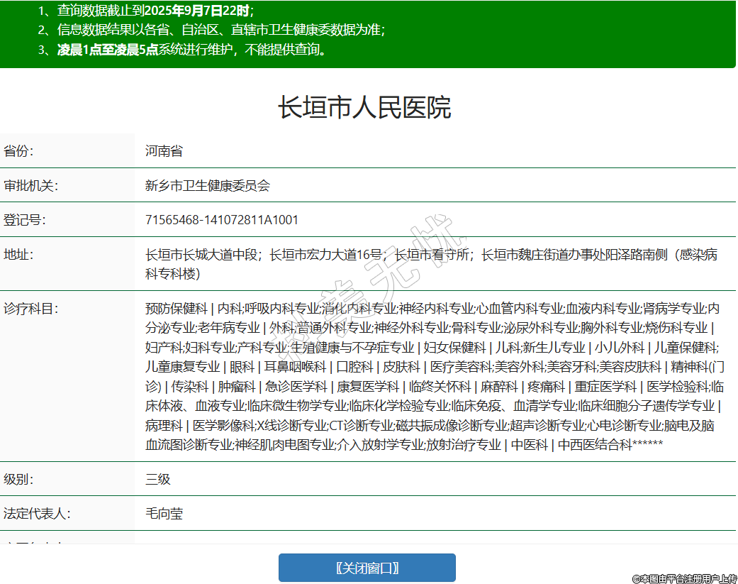 省份:河南省審批機(jī)關(guān):新鄉(xiāng)市衛(wèi)生健康委員會(huì)登記號(hào):71565468-141072811A1001地址:長(zhǎng)垣市長(zhǎng)城大道中段;長(zhǎng)垣市宏力大道16號(hào);長(zhǎng)垣市看守所;長(zhǎng)垣市魏莊街道辦事處陽(yáng)澤路南側(cè)(感染病科??茦牵?/div>診療科目:預(yù)防保健科 | 內(nèi)科;呼吸內(nèi)科專業(yè);消化內(nèi)科專業(yè);神經(jīng)內(nèi)科專業(yè);心血管內(nèi)科專業(yè);血液內(nèi)科專業(yè);腎病學(xué)專業(yè);內(nèi)分泌專業(yè);老年病專業(yè) | 外科;普通外科專業(yè);神經(jīng)外科專業(yè);骨科專業(yè);泌尿外科專業(yè);胸外科專業(yè);燒傷科專業(yè) | 婦產(chǎn)科;婦科專業(yè);產(chǎn)科專業(yè);生殖健康與不孕癥專業(yè) | 婦女保健科 | 兒科;新生兒專業(yè) | 小兒外科 | 兒童保健科;兒童康復(fù)專業(yè) | 眼科 | 耳鼻咽喉科 | 口腔科 | 皮膚科 | 醫(yī)療美容科;美容外科;美容牙科;美容皮膚科 | 精神科(門(mén)診) | 傳染科 | 腫瘤科 | 急診醫(yī)學(xué)科 | 康復(fù)醫(yī)學(xué)科 | 臨終關(guān)懷科 | 麻醉科 | 疼痛科 | 重癥醫(yī)學(xué)科 | 醫(yī)學(xué)檢驗(yàn)科;臨床體液、血液專業(yè);臨床微生物學(xué)專業(yè);臨床化學(xué)檢驗(yàn)專業(yè);臨床免疫、血清學(xué)專業(yè);臨床細(xì)胞分子遺傳學(xué)專業(yè) | 病理科 | 醫(yī)學(xué)影像科;X線診斷專業(yè);CT診斷專業(yè);磁共振成像診斷專業(yè);超聲診斷專業(yè);心電診斷專業(yè);腦電及腦血流圖診斷專業(yè);神經(jīng)肌肉電圖專業(yè);介入放射學(xué)專業(yè);放射治療專業(yè) | 中醫(yī)科 | 中西醫(yī)結(jié)合科******級(jí)別:三級(jí)法定代表人:毛向瑩主要負(fù)責(zé)人:***執(zhí)業(yè)許可證有效期:2024/10/22 -至- 2038/11/23