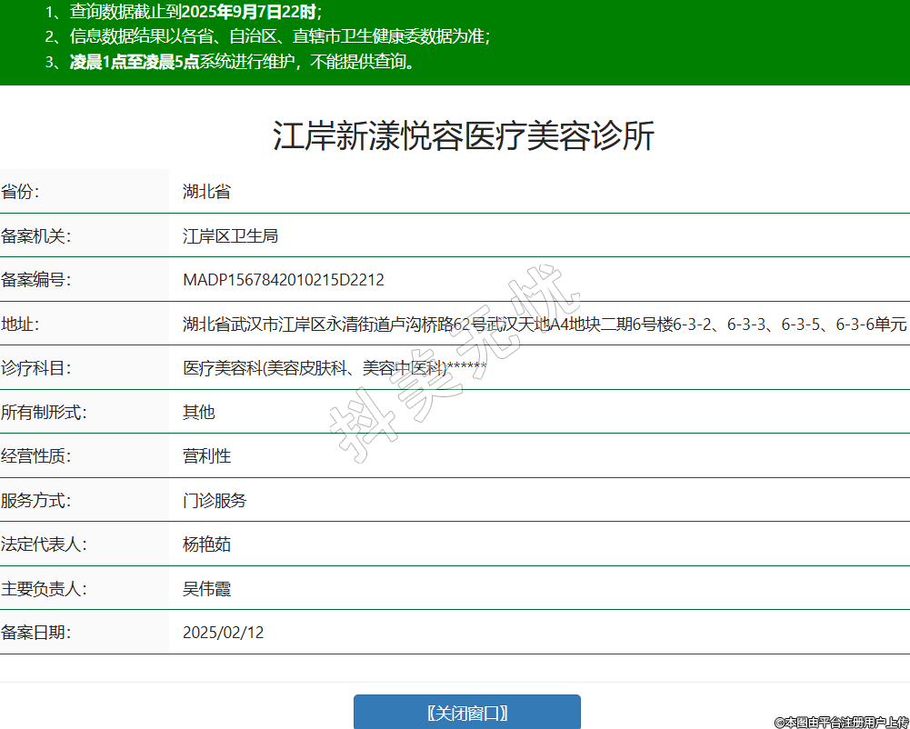 省份:湖北省備案機(jī)關(guān):江岸區(qū)衛(wèi)生局備案編號(hào):MADP1567842010215D2212地址:湖北省武漢市江岸區(qū)永清街道盧溝橋路62號(hào)武漢天地A4地塊二期6號(hào)樓6-3-2、6-3-3、6-3-5、6-3-6單元診療科目:醫(yī)療美容科(美容皮膚科、美容中醫(yī)科)******所有制形式:其他經(jīng)營(yíng)性質(zhì):營(yíng)利性服務(wù)方式:門(mén)診服務(wù)法定代表人:楊艷茹主要負(fù)責(zé)人:吳偉霞備案日期:2025/02/12 -