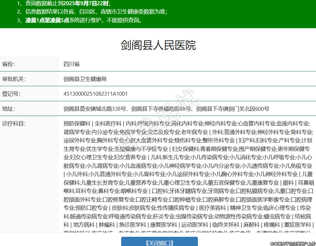省份:四川省審批機(jī)關(guān):劍閣縣衛(wèi)生健康局登記號:45130000251082311A1001地址:劍閣縣普安鎮(zhèn)城北路338號、劍閣縣下寺鎮(zhèn)福臨街88號、劍閣縣下寺鎮(zhèn)劍門關(guān)北段600號診療科目:預(yù)防保健科 | 全科醫(yī)療科 | 內(nèi)科;呼吸內(nèi)科專業(yè);消化內(nèi)科專業(yè);神經(jīng)內(nèi)科專業(yè);心血管內(nèi)科專業(yè);血液內(nèi)科專業(yè);腎病學(xué)專業(yè);內(nèi)分泌專業(yè);免疫學(xué)專業(yè);變態(tài)反應(yīng)專業(yè);老年病專業(yè) | 外科;普通外科專業(yè);神經(jīng)外科專業(yè);骨科專業(yè);泌尿外科專業(yè);胸外科專業(yè);心臟大血管外科專業(yè);燒傷科專業(yè);整形外科專業(yè) | 婦產(chǎn)科;婦科專業(yè);產(chǎn)科專業(yè);計(jì)劃生育專業(yè);優(yōu)生學(xué)專業(yè);生殖健康與不孕癥專業(yè) | 婦女保健科;青春期保健專業(yè);圍產(chǎn)期保健專業(yè);更年期保健專業(yè);婦女心理衛(wèi)生專業(yè);婦女營養(yǎng)專業(yè) | 兒科;新生兒專業(yè);小兒傳染病專業(yè);小兒消化專業(yè);小兒呼吸專業(yè);小兒心臟病專業(yè);小兒腎病專業(yè);小兒血液病專業(yè);小兒神經(jīng)病學(xué)專業(yè);小兒內(nèi)分泌專業(yè);小兒遺傳病專業(yè);小兒免疫專業(yè) | 小兒外科;小兒普通外科專業(yè);小兒骨科專業(yè);小兒泌尿外科專業(yè);小兒胸心外科專業(yè);小兒神經(jīng)外科專業(yè) | 兒童保健科;兒童生長發(fā)育專業(yè);兒童營養(yǎng)專業(yè);兒童心理衛(wèi)生專業(yè);兒童五官保健專業(yè);兒童康復(fù)專業(yè) | 眼科 | 耳鼻咽喉科;耳科專業(yè);鼻科專業(yè);咽喉科專業(yè) | 口腔科;牙體牙髓病專業(yè);牙周病專業(yè);口腔粘膜病專業(yè);兒童口腔專業(yè);口腔頜面外科專業(yè);口腔修復(fù)專業(yè);口腔正畸專業(yè);口腔種植專業(yè);口腔麻醉專業(yè);口腔頜面醫(yī)學(xué)影像專業(yè);口腔病理專業(yè);預(yù)防口腔專業(yè) | 皮膚科;皮膚病專業(yè);性傳播疾病專業(yè) | 醫(yī)療美容科 | 精神衛(wèi)生專業(yè);臨床心理專業(yè) | 傳染科;腸道傳染病專業(yè);呼吸道傳染病專業(yè);肝炎專業(yè);蟲媒傳染病專業(yè);動(dòng)物源性傳染病專業(yè);蠕蟲病專業(yè) | 結(jié)核病科 | 地方病科 | 腫瘤科 | 急診醫(yī)學(xué)科 | 康復(fù)醫(yī)學(xué)科 | 運(yùn)動(dòng)醫(yī)學(xué)科 | 臨終關(guān)懷科 | 麻醉科 | 疼痛科 | 重癥醫(yī)學(xué)科 | 醫(yī)學(xué)檢驗(yàn)科;臨床體液、血液專業(yè);臨床微生物學(xué)專業(yè);臨床化學(xué)檢驗(yàn)專業(yè);臨床免疫、血清學(xué)專業(yè);臨床細(xì)胞分子遺傳學(xué)專業(yè) | 病理科 | 醫(yī)學(xué)影像科;X線診斷專業(yè);CT診斷專業(yè);磁共振成像診斷專業(yè);超聲診斷專業(yè);心電診斷專業(yè);腦電及腦血流圖診斷專業(yè);神經(jīng)肌肉電圖專業(yè);介入放射學(xué)專業(yè);放射治療專業(yè) | 中醫(yī)科;內(nèi)科專業(yè);外科專業(yè);婦產(chǎn)科專業(yè);兒科專業(yè);皮膚科專業(yè);眼科專業(yè);耳鼻咽喉科專業(yè);口腔科專業(yè);腫瘤科專業(yè);骨傷科專業(yè);肛腸科專業(yè);老年病科專業(yè);針灸科專業(yè);推拿科專業(yè);康復(fù)醫(yī)學(xué)專業(yè);急診科專業(yè);預(yù)防保健科專業(yè) | 中西醫(yī)結(jié)合科******級別:三級法定代表人:高大龍主要負(fù)責(zé)人:唐江山執(zhí)業(yè)許可證有效期:2022/06/07 -至- 2037/06/06 -
