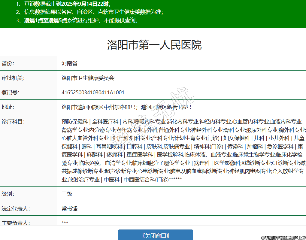 省份:河南省審批機關(guān):洛陽市衛(wèi)生健康委員會登記號:41652500341030411A1001地址:洛陽市瀍河回族區(qū)中州東路88號;瀍河回族區(qū)新街156號診療科目:預(yù)防保健科 | 全科醫(yī)療科 | 內(nèi)科;呼吸內(nèi)科專業(yè);消化內(nèi)科專業(yè);神經(jīng)內(nèi)科專業(yè);心血管內(nèi)科專業(yè);血液內(nèi)科專業(yè);腎病學(xué)專業(yè);內(nèi)分泌專業(yè);老年病專業(yè) | 外科;普通外科專業(yè);神經(jīng)外科專業(yè);骨科專業(yè);泌尿外科專業(yè);胸外科專業(yè);心臟大血管外科專業(yè) | 婦產(chǎn)科;婦科專業(yè);產(chǎn)科專業(yè);計劃生育專業(yè)(門診) | 婦女保健科 | 兒科 | 小兒外科 | 兒童保健科 | 眼科 | 耳鼻咽喉科 | 口腔科 | 皮膚科;皮膚病專業(yè) | 精神科(門診) | 傳染科 | 腫瘤科 | 急診醫(yī)學(xué)科 | 康復(fù)醫(yī)學(xué)科 | 麻醉科 | 疼痛科 | 重癥醫(yī)學(xué)科 | 醫(yī)學(xué)檢驗科;臨床體液、血液專業(yè);臨床微生物學(xué)專業(yè);臨床化學(xué)檢驗專業(yè);臨床免疫、血清學(xué)專業(yè);臨床細(xì)胞分子遺傳學(xué)專業(yè) | 病理科 | 醫(yī)學(xué)影像科;X線診斷專業(yè);CT診斷專業(yè);磁共振成像診斷專業(yè);超聲診斷專業(yè);心電診斷專業(yè);腦電及腦血流圖診斷專業(yè);神經(jīng)肌肉電圖專業(yè);介入放射學(xué)專業(yè);放射治療專業(yè) | 中醫(yī)科 | 中西醫(yī)結(jié)合科(門診)******級別:三級法定代表人:常書鋒主要負(fù)責(zé)人:***執(zhí)業(yè)許可證有效期:2025/08/11 -至- 2033/04/07 -