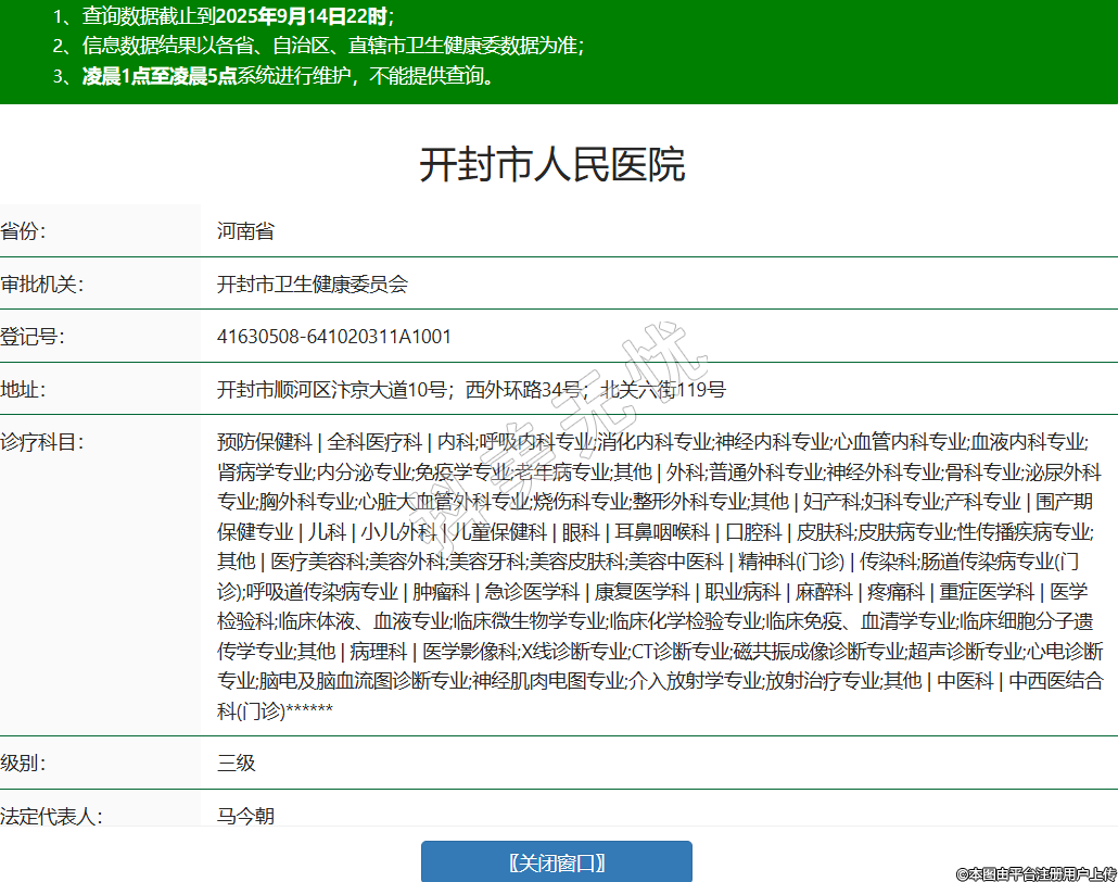 省份:河南省審批機(jī)關(guān):開封市衛(wèi)生健康委員會(huì)登記號(hào):41630508-641020311A1001地址:開封市順河區(qū)汴京大道10號(hào);西外環(huán)路34號(hào);北關(guān)六街119號(hào)診療科目:預(yù)防保健科 | 全科醫(yī)療科 | 內(nèi)科;呼吸內(nèi)科專業(yè);消化內(nèi)科專業(yè);神經(jīng)內(nèi)科專業(yè);心血管內(nèi)科專業(yè);血液內(nèi)科專業(yè);腎病學(xué)專業(yè);內(nèi)分泌專業(yè);免疫學(xué)專業(yè);老年病專業(yè);其他 | 外科;普通外科專業(yè);神經(jīng)外科專業(yè);骨科專業(yè);泌尿外科專業(yè);胸外科專業(yè);心臟大血管外科專業(yè);燒傷科專業(yè);整形外科專業(yè);其他 | 婦產(chǎn)科;婦科專業(yè);產(chǎn)科專業(yè) | 圍產(chǎn)期保健專業(yè) | 兒科 | 小兒外科 | 兒童保健科 | 眼科 | 耳鼻咽喉科 | 口腔科 | 皮膚科;皮膚病專業(yè);性傳播疾病專業(yè);其他 | 醫(yī)療美容科;美容外科;美容牙科;美容皮膚科;美容中醫(yī)科 | 精神科(門診) | 傳染科;腸道傳染病專業(yè)(門診);呼吸道傳染病專業(yè) | 腫瘤科 | 急診醫(yī)學(xué)科 | 康復(fù)醫(yī)學(xué)科 | 職業(yè)病科 | 麻醉科 | 疼痛科 | 重癥醫(yī)學(xué)科 | 醫(yī)學(xué)檢驗(yàn)科;臨床體液、血液專業(yè);臨床微生物學(xué)專業(yè);臨床化學(xué)檢驗(yàn)專業(yè);臨床免疫、血清學(xué)專業(yè);臨床細(xì)胞分子遺傳學(xué)專業(yè);其他 | 病理科 | 醫(yī)學(xué)影像科;X線診斷專業(yè);CT診斷專業(yè);磁共振成像診斷專業(yè);超聲診斷專業(yè);心電診斷專業(yè);腦電及腦血流圖診斷專業(yè);神經(jīng)肌肉電圖專業(yè);介入放射學(xué)專業(yè);放射治療專業(yè);其他 | 中醫(yī)科 | 中西醫(yī)結(jié)合科(門診)******級(jí)別:三級(jí)法定代表人:馬今朝主要負(fù)責(zé)人:***執(zhí)業(yè)許可證有效期:2024/12/23 -至- 2033/04/07 -