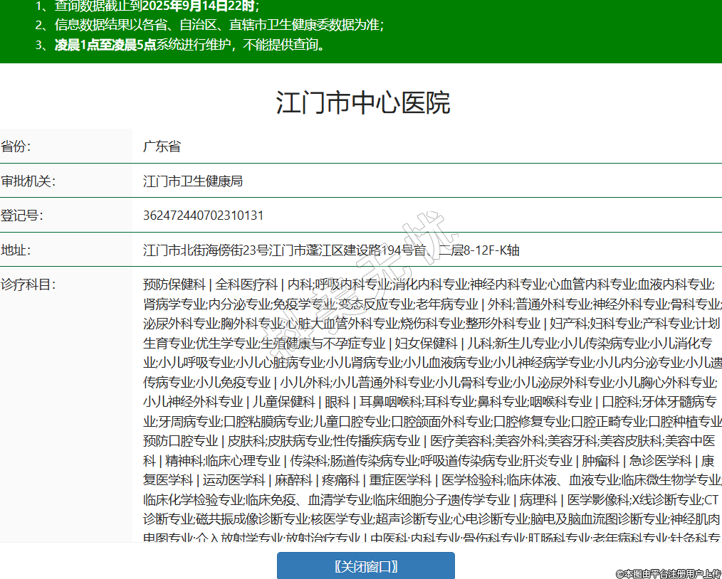 省份:廣東省審批機(jī)關(guān):江門市衛(wèi)生健康局登記號(hào):362472440702310131地址:江門市北街海傍街23號(hào)江門市蓬江區(qū)建設(shè)路194號(hào)首、二層8-12F-K軸診療科目:預(yù)防保健科 | 全科醫(yī)療科 | 內(nèi)科;呼吸內(nèi)科專業(yè);消化內(nèi)科專業(yè);神經(jīng)內(nèi)科專業(yè);心血管內(nèi)科專業(yè);血液內(nèi)科專業(yè);腎病學(xué)專業(yè);內(nèi)分泌專業(yè);免疫學(xué)專業(yè);變態(tài)反應(yīng)專業(yè);老年病專業(yè) | 外科;普通外科專業(yè);神經(jīng)外科專業(yè);骨科專業(yè);泌尿外科專業(yè);胸外科專業(yè);心臟大血管外科專業(yè);燒傷科專業(yè);整形外科專業(yè) | 婦產(chǎn)科;婦科專業(yè);產(chǎn)科專業(yè);計(jì)劃生育專業(yè);優(yōu)生學(xué)專業(yè);生殖健康與不孕癥專業(yè) | 婦女保健科 | 兒科;新生兒專業(yè);小兒傳染病專業(yè);小兒消化專業(yè);小兒呼吸專業(yè);小兒心臟病專業(yè);小兒腎病專業(yè);小兒血液病專業(yè);小兒神經(jīng)病學(xué)專業(yè);小兒內(nèi)分泌專業(yè);小兒遺傳病專業(yè);小兒免疫專業(yè) | 小兒外科;小兒普通外科專業(yè);小兒骨科專業(yè);小兒泌尿外科專業(yè);小兒胸心外科專業(yè);小兒神經(jīng)外科專業(yè) | 兒童保健科 | 眼科 | 耳鼻咽喉科;耳科專業(yè);鼻科專業(yè);咽喉科專業(yè) | 口腔科;牙體牙髓病專業(yè);牙周病專業(yè);口腔粘膜病專業(yè);兒童口腔專業(yè);口腔頜面外科專業(yè);口腔修復(fù)專業(yè);口腔正畸專業(yè);口腔種植專業(yè);預(yù)防口腔專業(yè) | 皮膚科;皮膚病專業(yè);性傳播疾病專業(yè) | 醫(yī)療美容科;美容外科;美容牙科;美容皮膚科;美容中醫(yī)科 | 精神科;臨床心理專業(yè) | 傳染科;腸道傳染病專業(yè);呼吸道傳染病專業(yè);肝炎專業(yè) | 腫瘤科 | 急診醫(yī)學(xué)科 | 康復(fù)醫(yī)學(xué)科 | 運(yùn)動(dòng)醫(yī)學(xué)科 | 麻醉科 | 疼痛科 | 重癥醫(yī)學(xué)科 | 醫(yī)學(xué)檢驗(yàn)科;臨床體液、血液專業(yè);臨床微生物學(xué)專業(yè);臨床化學(xué)檢驗(yàn)專業(yè);臨床免疫、血清學(xué)專業(yè);臨床細(xì)胞分子遺傳學(xué)專業(yè) | 病理科 | 醫(yī)學(xué)影像科;X線診斷專業(yè);CT診斷專業(yè);磁共振成像診斷專業(yè);核醫(yī)學(xué)專業(yè);超聲診斷專業(yè);心電診斷專業(yè);腦電及腦血流圖診斷專業(yè);神經(jīng)肌肉電圖專業(yè);介入放射學(xué)專業(yè);放射治療專業(yè) | 中醫(yī)科;內(nèi)科專業(yè);骨傷科專業(yè);肛腸科專業(yè);老年病科專業(yè);針灸科專業(yè);推拿科專業(yè);預(yù)防保健科專業(yè) | 中西醫(yī)結(jié)合科******級(jí)別:三級(jí)法定代表人:阮曉紅主要負(fù)責(zé)人:阮曉紅執(zhí)業(yè)許可證有效期:2025/08/05 -至- 2040/08/04 -