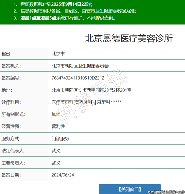 省份:北京市備案機(jī)關(guān):北京市朝陽區(qū)衛(wèi)生健康委員會(huì)備案編號(hào):76847492411010519D2212地址:北京市朝陽區(qū)安貞西里四區(qū)23號(hào)2樓201室診療科目:醫(yī)療美容科(美容外科) | 麻醉科******所有制形式:其他經(jīng)營性質(zhì):營利性服務(wù)方式:門診服務(wù)法定代表人:武義主要負(fù)責(zé)人:武義備案日期:2024/06/24 -