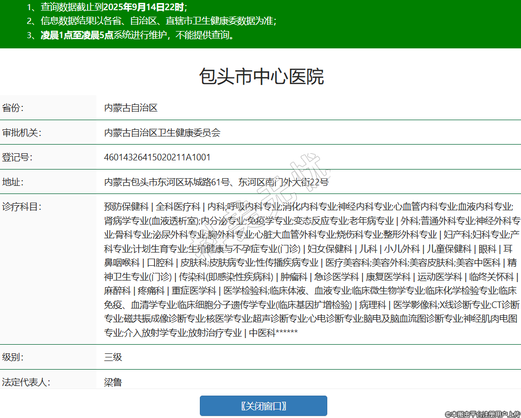 省份:內(nèi)蒙古自治區(qū)審批機(jī)關(guān):內(nèi)蒙古自治區(qū)衛(wèi)生健康委員會(huì)登記號(hào):46014326415020211A1001地址:內(nèi)蒙古包頭市東河區(qū)環(huán)城路61號(hào)、東河區(qū)南門(mén)外大街22號(hào)診療科目:預(yù)防保健科 | 全科醫(yī)療科 | 內(nèi)科;呼吸內(nèi)科專(zhuān)業(yè);消化內(nèi)科專(zhuān)業(yè);神經(jīng)內(nèi)科專(zhuān)業(yè);心血管內(nèi)科專(zhuān)業(yè);血液內(nèi)科專(zhuān)業(yè);腎病學(xué)專(zhuān)業(yè)(血液透析室);內(nèi)分泌專(zhuān)業(yè);免疫學(xué)專(zhuān)業(yè);變態(tài)反應(yīng)專(zhuān)業(yè);老年病專(zhuān)業(yè) | 外科;普通外科專(zhuān)業(yè);神經(jīng)外科專(zhuān)業(yè);骨科專(zhuān)業(yè);泌尿外科專(zhuān)業(yè);胸外科專(zhuān)業(yè);心臟大血管外科專(zhuān)業(yè);燒傷科專(zhuān)業(yè);整形外科專(zhuān)業(yè) | 婦產(chǎn)科;婦科專(zhuān)業(yè);產(chǎn)科專(zhuān)業(yè);計(jì)劃生育專(zhuān)業(yè);生殖健康與不孕癥專(zhuān)業(yè)(門(mén)診) | 婦女保健科 | 兒科 | 小兒外科 | 兒童保健科 | 眼科 | 耳鼻咽喉科 | 口腔科 | 皮膚科;皮膚病專(zhuān)業(yè);性傳播疾病專(zhuān)業(yè) | 醫(yī)療美容科;美容外科;美容皮膚科;美容中醫(yī)科 | 精神衛(wèi)生專(zhuān)業(yè)(門(mén)診) | 傳染科(即感染性疾病科) | 腫瘤科 | 急診醫(yī)學(xué)科 | 康復(fù)醫(yī)學(xué)科 | 運(yùn)動(dòng)醫(yī)學(xué)科 | 臨終關(guān)懷科 | 麻醉科 | 疼痛科 | 重癥醫(yī)學(xué)科 | 醫(yī)學(xué)檢驗(yàn)科;臨床體液、血液專(zhuān)業(yè);臨床微生物學(xué)專(zhuān)業(yè);臨床化學(xué)檢驗(yàn)專(zhuān)業(yè);臨床免疫、血清學(xué)專(zhuān)業(yè);臨床細(xì)胞分子遺傳學(xué)專(zhuān)業(yè)(臨床基因擴(kuò)增檢驗(yàn)) | 病理科 | 醫(yī)學(xué)影像科;X線(xiàn)診斷專(zhuān)業(yè);CT診斷專(zhuān)業(yè);磁共振成像診斷專(zhuān)業(yè);核醫(yī)學(xué)專(zhuān)業(yè);超聲診斷專(zhuān)業(yè);心電診斷專(zhuān)業(yè);腦電及腦血流圖診斷專(zhuān)業(yè);神經(jīng)肌肉電圖專(zhuān)業(yè);介入放射學(xué)專(zhuān)業(yè);放射治療專(zhuān)業(yè) | 中醫(yī)科******級(jí)別:三級(jí)法定代表人:梁魯主要負(fù)責(zé)人:梁魯執(zhí)業(yè)許可證有效期:2025/08/20 -至- 2027/03/01 -