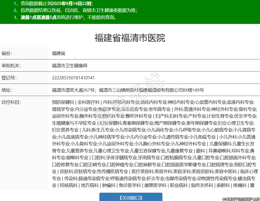 省份:福建省審批機(jī)關(guān):福清市衛(wèi)生健康局登記號(hào):222285350181410141地址:福清市清榮大道267號(hào);福清市三山鎮(zhèn)前薛村福建福清核電有限公司BX樓149號(hào)診療科目:預(yù)防保健科 | 全科醫(yī)療科 | 內(nèi)科;呼吸內(nèi)科專業(yè);消化內(nèi)科專業(yè);神經(jīng)內(nèi)科專業(yè);心血管內(nèi)科專業(yè);血液內(nèi)科專業(yè);腎病學(xué)專業(yè);內(nèi)分泌專業(yè);免疫學(xué)專業(yè);變態(tài)反應(yīng)專業(yè);老年病專業(yè) | 外科;普通外科專業(yè);神經(jīng)外科專業(yè);骨科專業(yè);泌尿外科專業(yè);胸外科專業(yè);燒傷科專業(yè);整形外科專業(yè) | 婦產(chǎn)科;婦科專業(yè);產(chǎn)科專業(yè);計(jì)劃生育專業(yè);優(yōu)生學(xué)專業(yè);生殖健康與不孕癥專業(yè) | 婦女保健科;青春期保健專業(yè);圍產(chǎn)期保健專業(yè);更年期保健專業(yè);婦女心理衛(wèi)生專業(yè);婦女營(yíng)養(yǎng)專業(yè) | 兒科;新生兒專業(yè);小兒傳染病專業(yè);小兒消化專業(yè);小兒呼吸專業(yè);小兒心臟病專業(yè);小兒腎病專業(yè);小兒血液病專業(yè);小兒神經(jīng)病學(xué)專業(yè);小兒內(nèi)分泌專業(yè);小兒遺傳病專業(yè);小兒免疫專業(yè) | 小兒外科;小兒普通外科專業(yè);小兒骨科專業(yè);小兒泌尿外科專業(yè);小兒胸心外科專業(yè);小兒神經(jīng)外科專業(yè) | 兒童保健科;兒童生長(zhǎng)發(fā)育專業(yè);兒童營(yíng)養(yǎng)專業(yè);兒童心理衛(wèi)生專業(yè);兒童五官保健專業(yè);兒童康復(fù)專業(yè) | 眼科 | 耳鼻咽喉科;耳科專業(yè);鼻科專業(yè);咽喉科專業(yè) | 口腔科;牙體牙髓病專業(yè);牙周病專業(yè);口腔粘膜病專業(yè);兒童口腔專業(yè);口腔頜面外科專業(yè);口腔修復(fù)專業(yè);口腔正畸專業(yè);口腔種植專業(yè);口腔麻醉專業(yè);口腔頜面醫(yī)學(xué)影像專業(yè);口腔病理專業(yè);預(yù)防口腔專業(yè) | 皮膚科;皮膚病專業(yè);性傳播疾病專業(yè) | 醫(yī)療美容科;美容外科;美容牙科;美容皮膚科;美容中醫(yī)科 | 臨床心理專業(yè) | 傳染科;腸道傳染病專業(yè);呼吸道傳染病專業(yè);肝炎專業(yè);蟲媒傳染病專業(yè);動(dòng)物源性傳染病專業(yè);蠕蟲病專業(yè) | 結(jié)核病科 | 地方病科 | 腫瘤科 | 急診醫(yī)學(xué)科 | 康復(fù)醫(yī)學(xué)科 | 職業(yè)病科 | 臨終關(guān)懷科 | 麻醉科 | 疼痛科 | 重癥醫(yī)學(xué)科 | 醫(yī)學(xué)檢驗(yàn)科;臨床體液、血液專業(yè);臨床微生物學(xué)專業(yè);臨床化學(xué)檢驗(yàn)專業(yè);臨床免疫、血清學(xué)專業(yè);臨床細(xì)胞分子遺傳學(xué)專業(yè) | 病理科 | 醫(yī)學(xué)影像科;X線診斷專業(yè);CT診斷專業(yè);磁共振成像診斷專業(yè);核醫(yī)學(xué)專業(yè);超聲診斷專業(yè);心電診斷專業(yè);腦電及腦血流圖診斷專業(yè);神經(jīng)肌肉電圖專業(yè);介入放射學(xué)專業(yè) | 中醫(yī)科;內(nèi)科專業(yè);外科專業(yè);婦產(chǎn)科專業(yè);兒科專業(yè);皮膚科專業(yè);眼科專業(yè);耳鼻咽喉科專業(yè);口腔科專業(yè);腫瘤科專業(yè);骨傷科專業(yè);肛腸科專業(yè);老年病科專業(yè);針灸科專業(yè);推拿科專業(yè);康復(fù)醫(yī)學(xué)專業(yè);急診科專業(yè);預(yù)防保健科專業(yè) | 中西醫(yī)結(jié)合科******級(jí)別:三級(jí)法定代表人:林仕忠主要負(fù)責(zé)人:林仕忠執(zhí)業(yè)許可證有效期:2023/03/29 -至- 2029/03/28 -