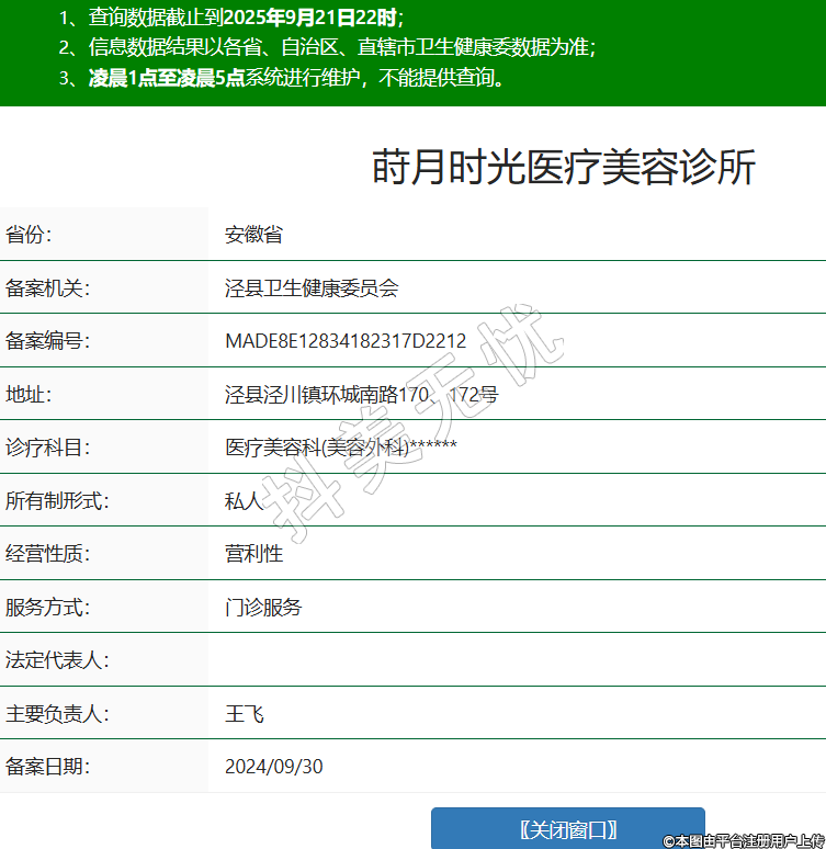 省份:安徽省備案機(jī)關(guān):涇縣衛(wèi)生健康委員會(huì)備案編號(hào):MADE8E12834182317D2212地址:涇縣涇川鎮(zhèn)環(huán)城南路170、172號(hào)診療科目:醫(yī)療美容科(美容外科)******所有制形式:私人經(jīng)營(yíng)性質(zhì):營(yíng)利性服務(wù)方式:門(mén)診服務(wù)法定代表人:主要負(fù)責(zé)人:王飛備案日期:2024/09/30 -